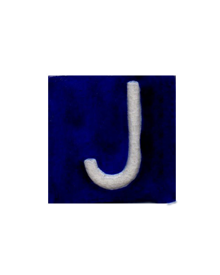 White J alphabet blue tile.. Unique, hand painted tiles for your kitchen or other tiling project. Tile is 2x2" in size. Delivery time is normally 5 to 7 business days. If the item is out of stock, production and delivery will take 2 to 3 weeks