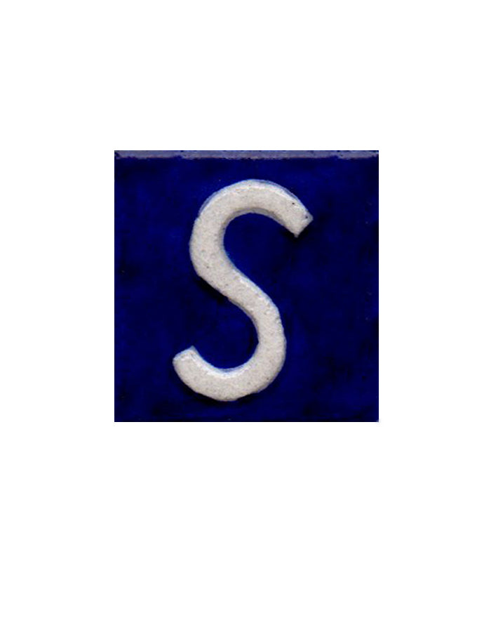 White S alphabet blue tile.. Unique, hand painted tiles for your kitchen or other tiling project. Tile is 2x2" in size. Delivery time is normally 5 to 7 business days. If the item is out of stock, production and delivery will take 2 to 3 weeks