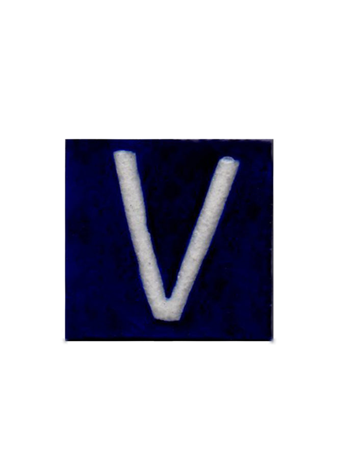 White V alphabet blue tile.. Unique, hand painted tiles for your kitchen or other tiling project. Tile is 2x2" in size. Delivery time is normally 5 to 7 business days. If the item is out of stock, production and delivery will take 2 to 3 weeks