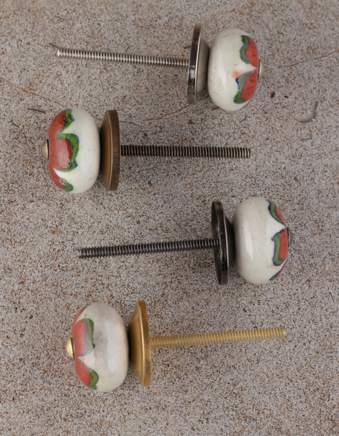Round Beaded Antique Drawer Cabinet Knob . Unique, hand painted cabinet knobs for your kitchen cabinets. 1.2" in diameter. Includes screws for installation. Delivery time is normally 5 to 7 business days. If the item is out of stock, production and delivery will take 2 to 3 weeks. Minimum order of three knobs - mix and match.