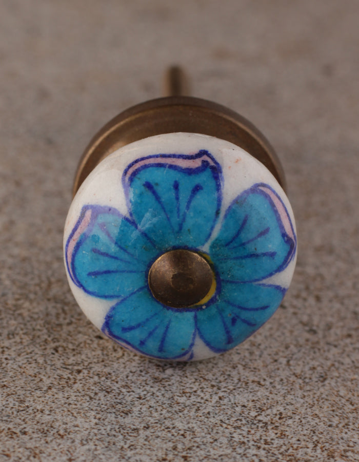 Turquoise Flower On White Ceramic Kitchen Cabinet Knob