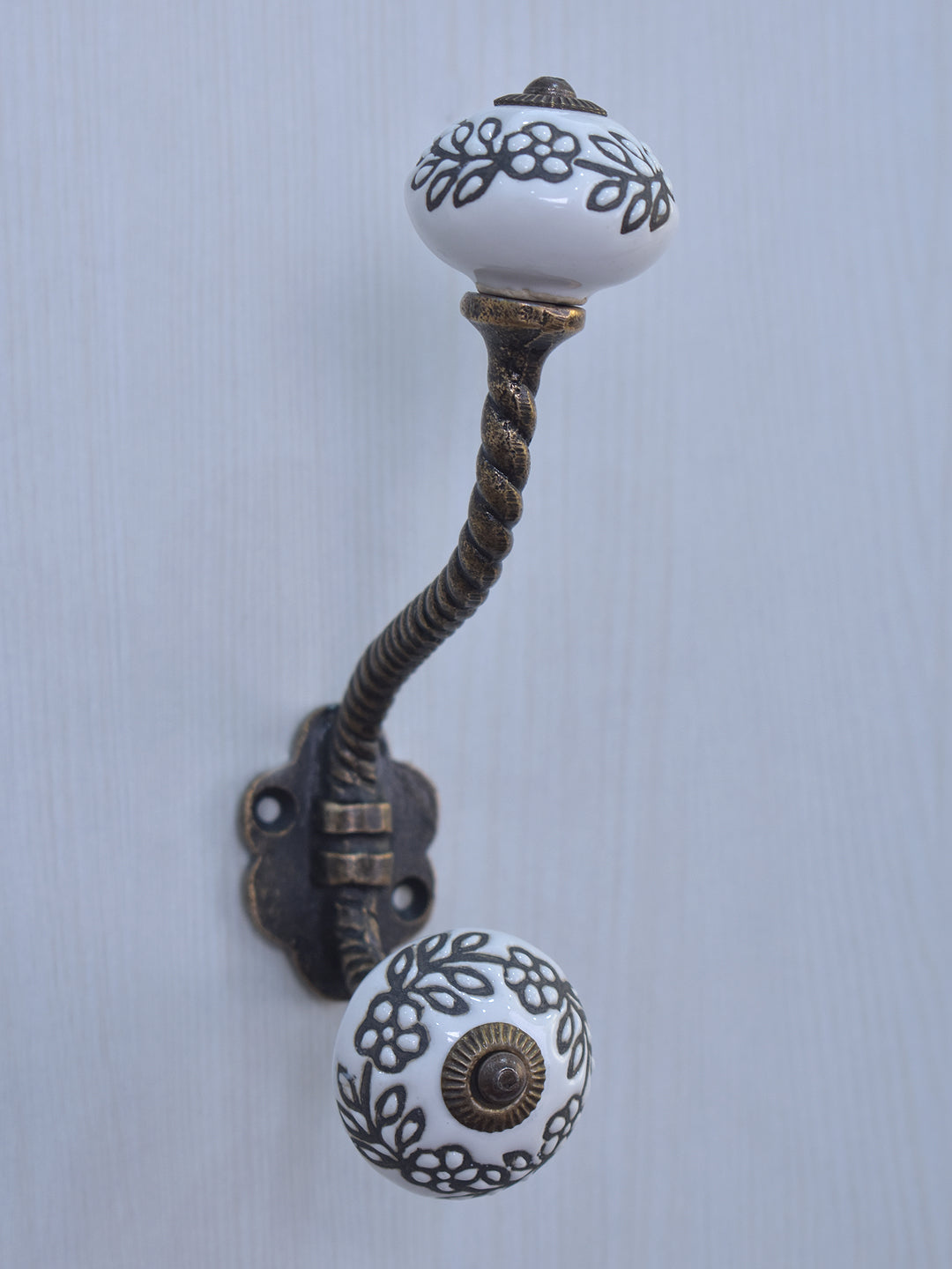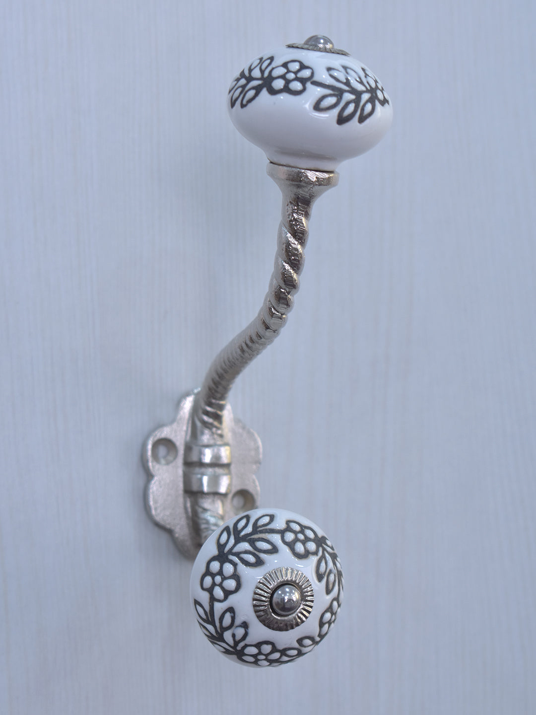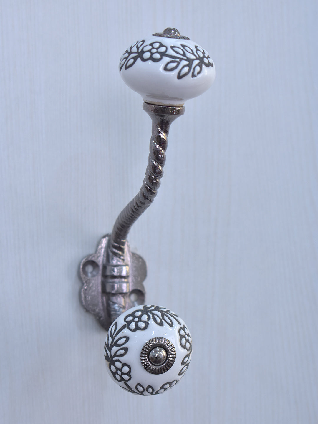 Black Flower On White Ceramic Cabinet Knob With Metal Wall Hanger