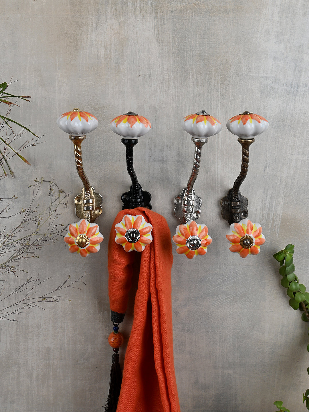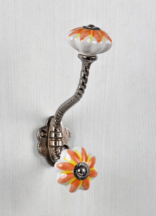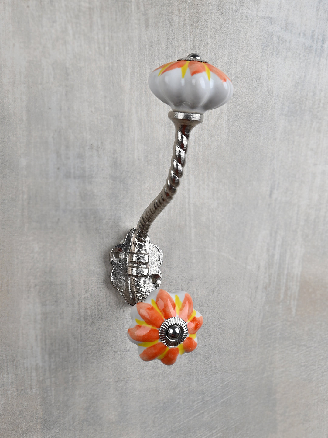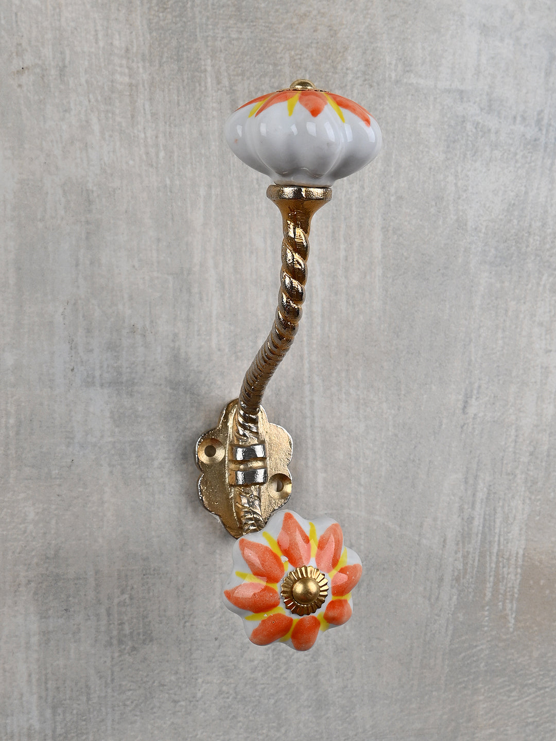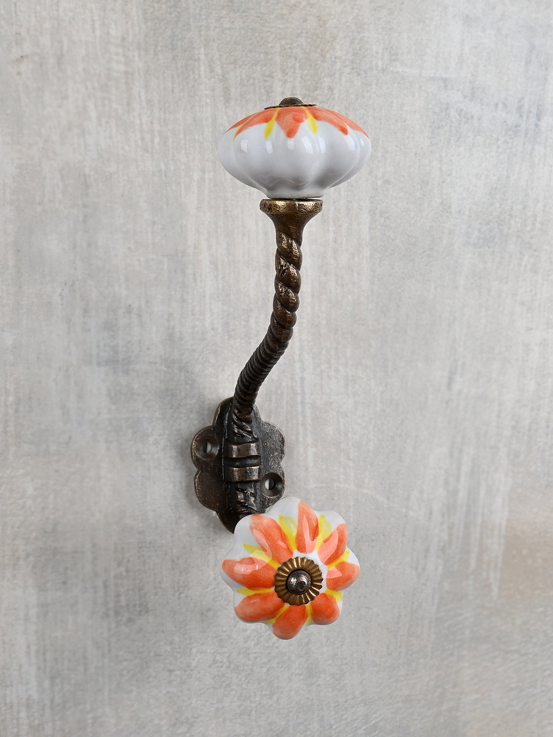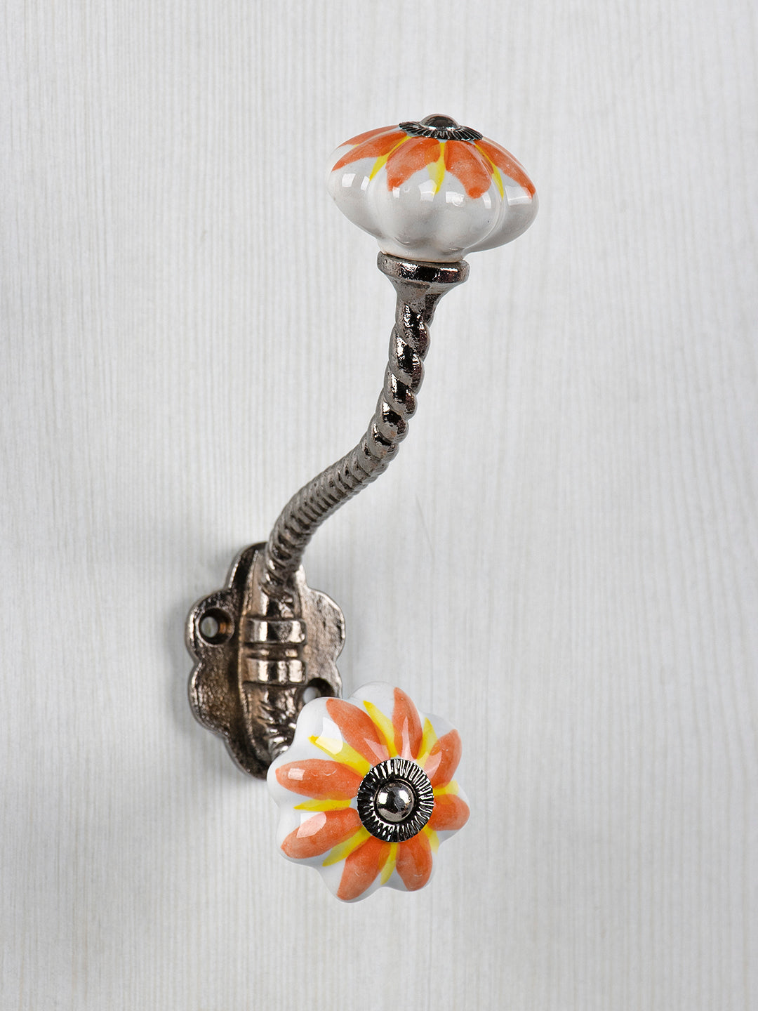 White Handpainted Ceramic Door Knob With Red And Yellow Flower With Metal Wall Hanger