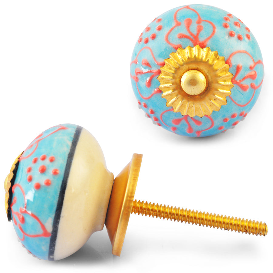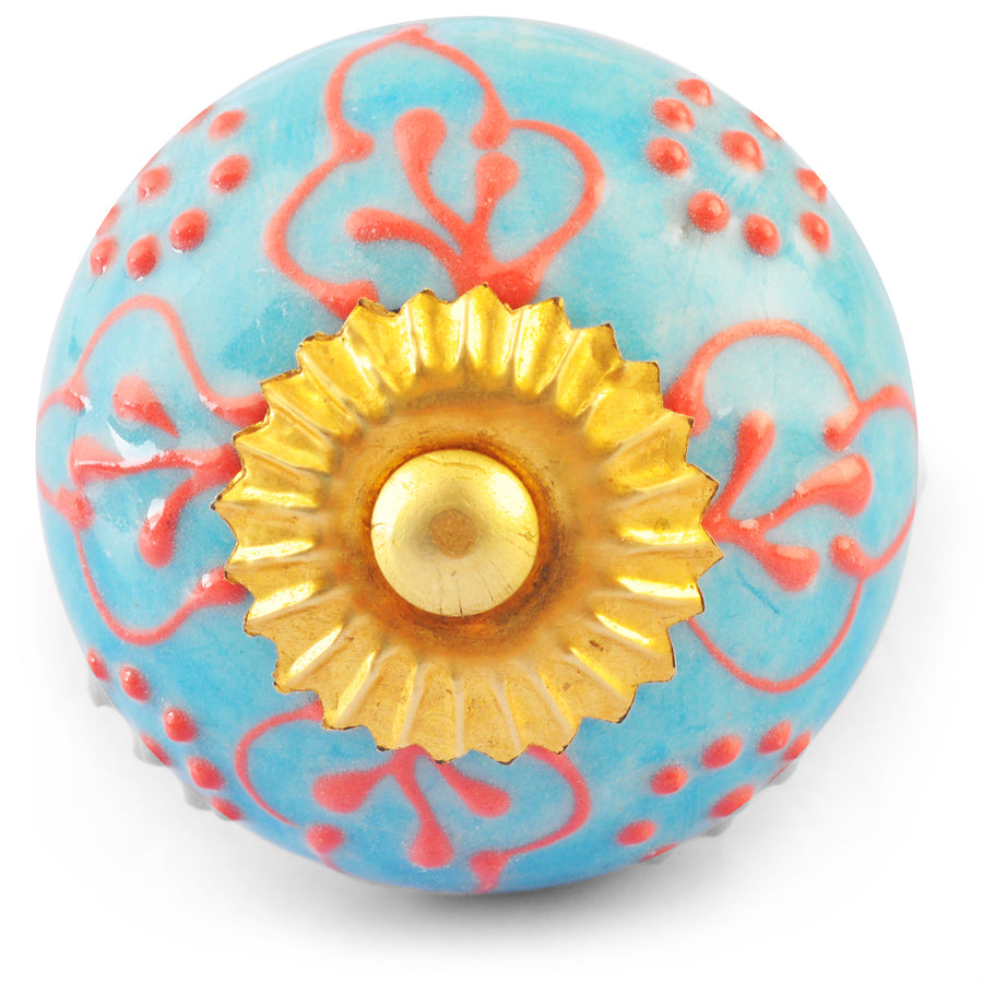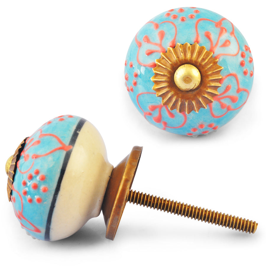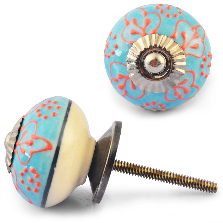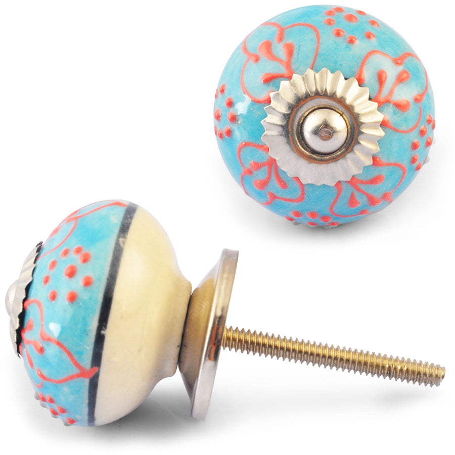Red design on Turquoise and White Base knob, perfect for your kitchen and bathroom cabinets! The knob is 1.7" in diameter and includes screws for installation. Delivery time is normally 5 to 7 business days. If the item is out of stock, production and delivery will take 4 to 5 weeks. Minimum order of three knobs - mix and match.