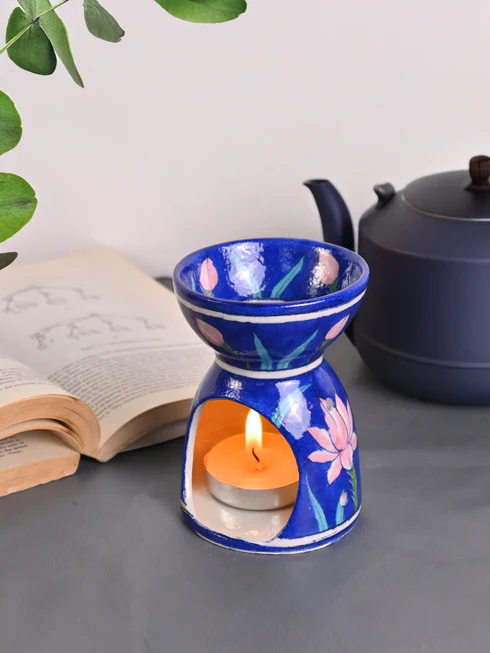 Blue Pottery Handmade Aroma Oil Burner in Blue Base with Pink lotus Flower