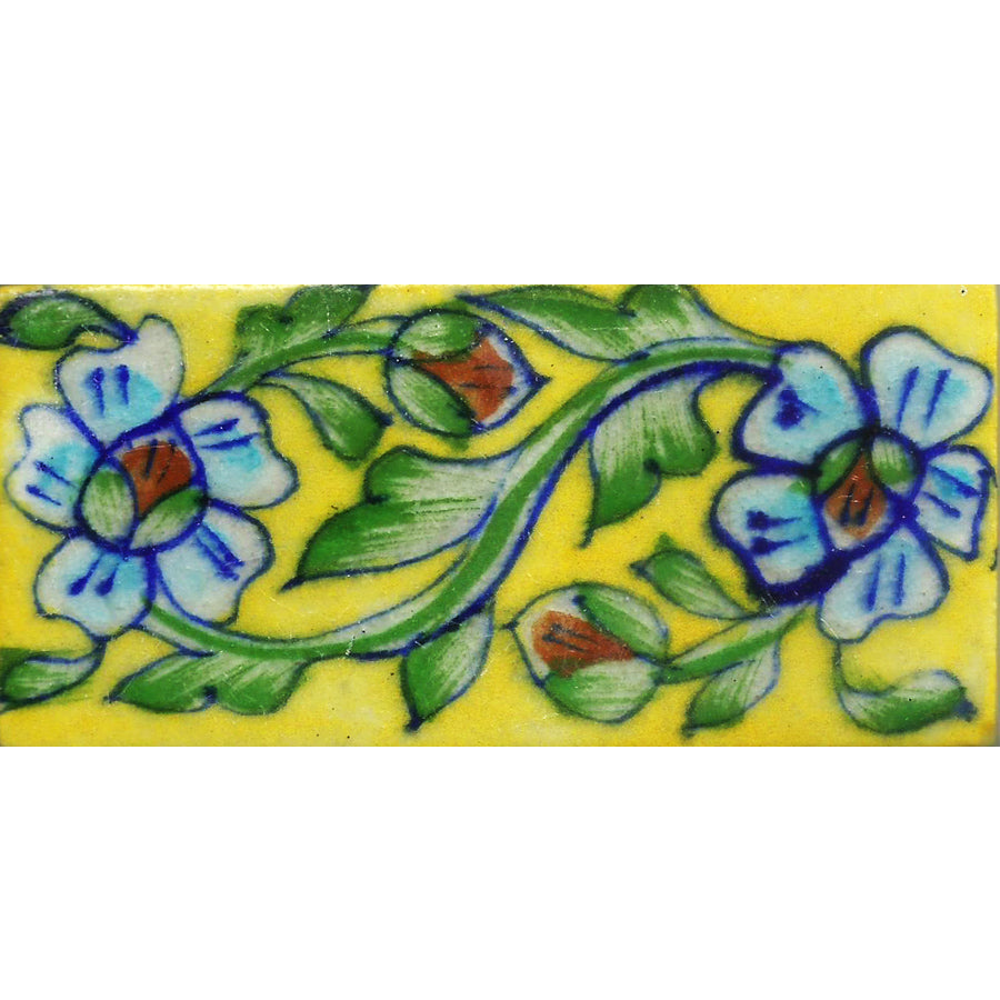 Turquoise Flowers With Green Leaves On Yellow Base Tile