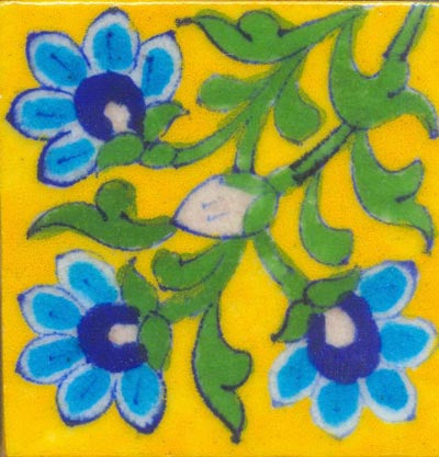 Blue and turquoise flower with green leaves on yellow tile (3x3-BPT19)