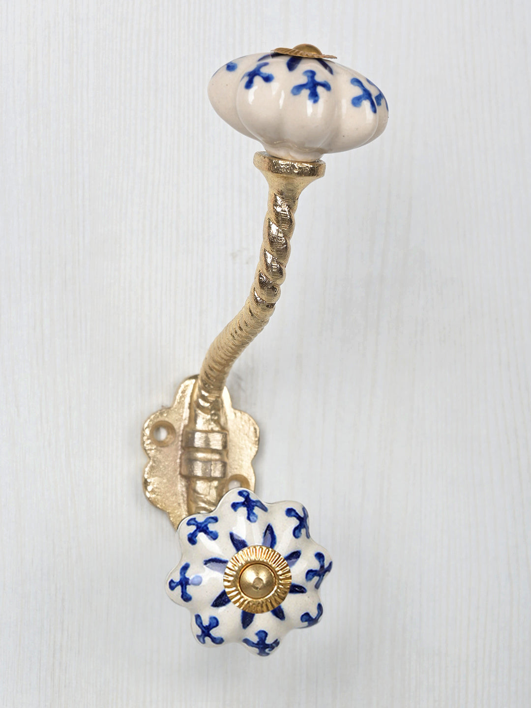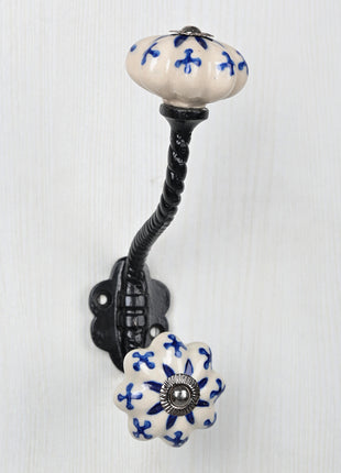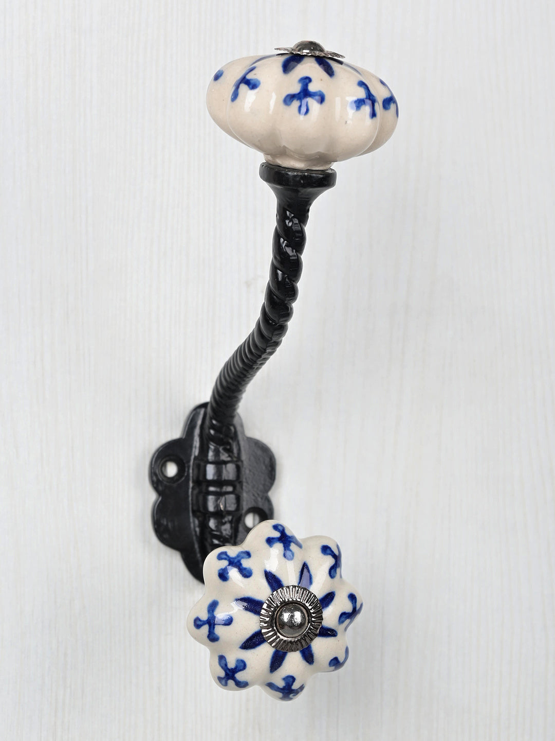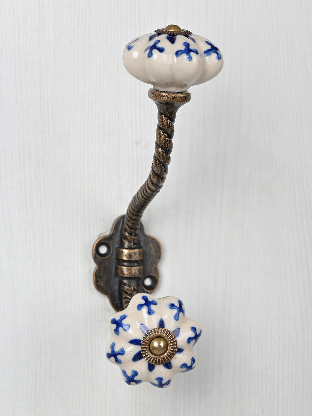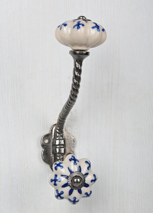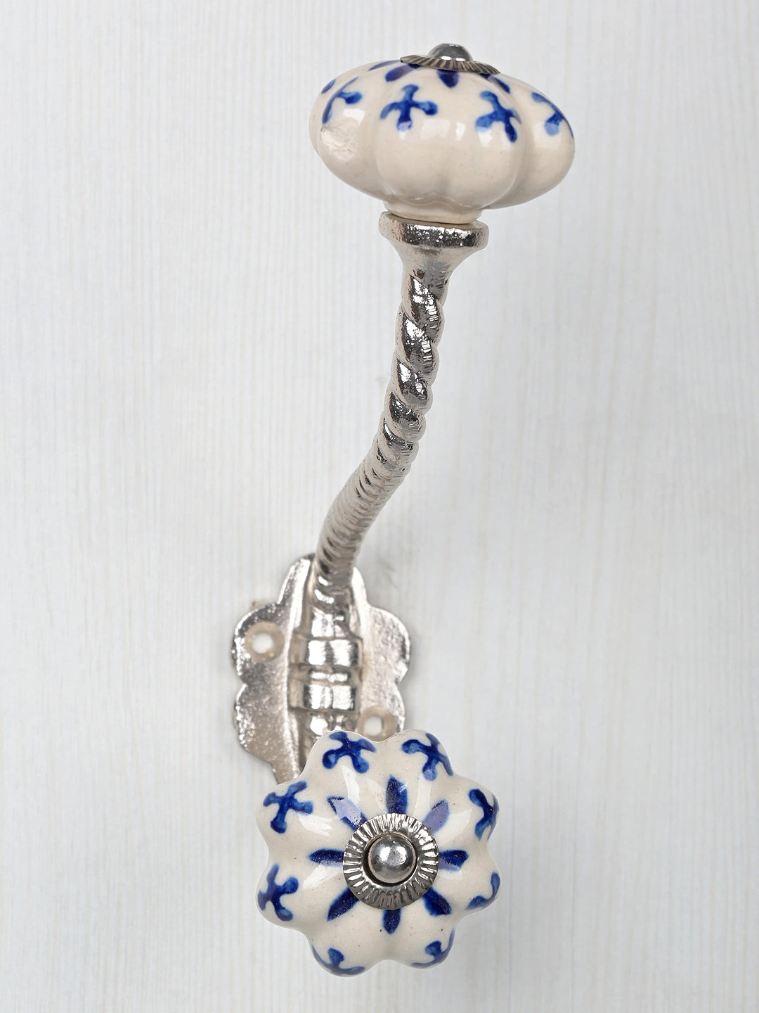 Blue Design On White Ceramic Cabinet Knob With Metal Wall Hanger