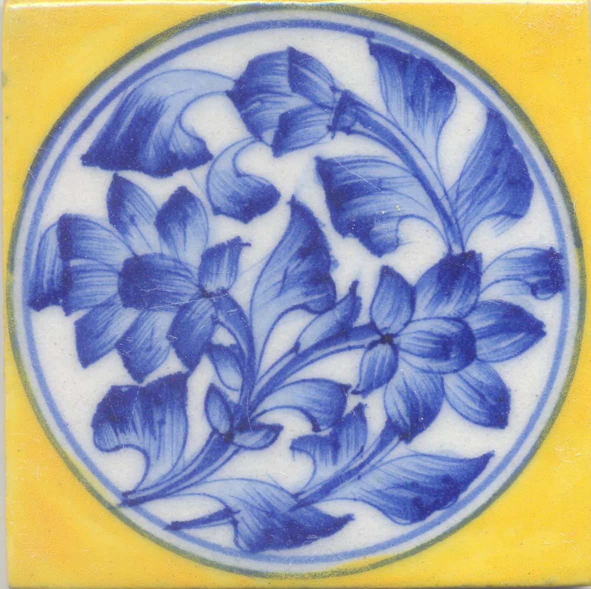 Blue Flower and leaf with Yellow Base Tiles . Unique, hand painted tiles for your kitchen or other tiling project. Tile is 4x4" in size. Delivery time is normally 5 to 7 business days. If the item is out of stock, production and delivery will take 2 to 3 weeks.
