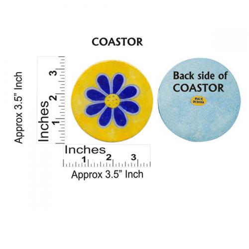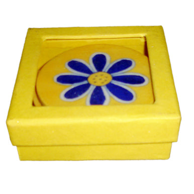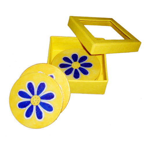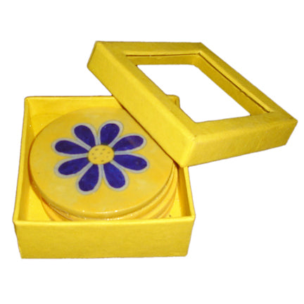 Blue Pottery Coaster Set - Round Yellow Coasters with Blue Flower