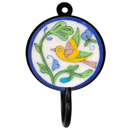 Blue Pottery Round Iron Wall Hook - Pink, Blue, Green and Yellow Bird with Flowers