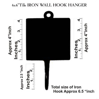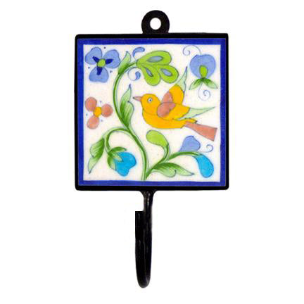 Blue Pottery Square Iron Wall Hook - Pink, Blue, Yellow, Green and Turquoise Bird with Flowers