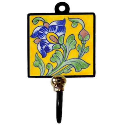 Blue Pottery Square Iron Wall Hook - Yellow, Green, Blue and Pink with Flowers