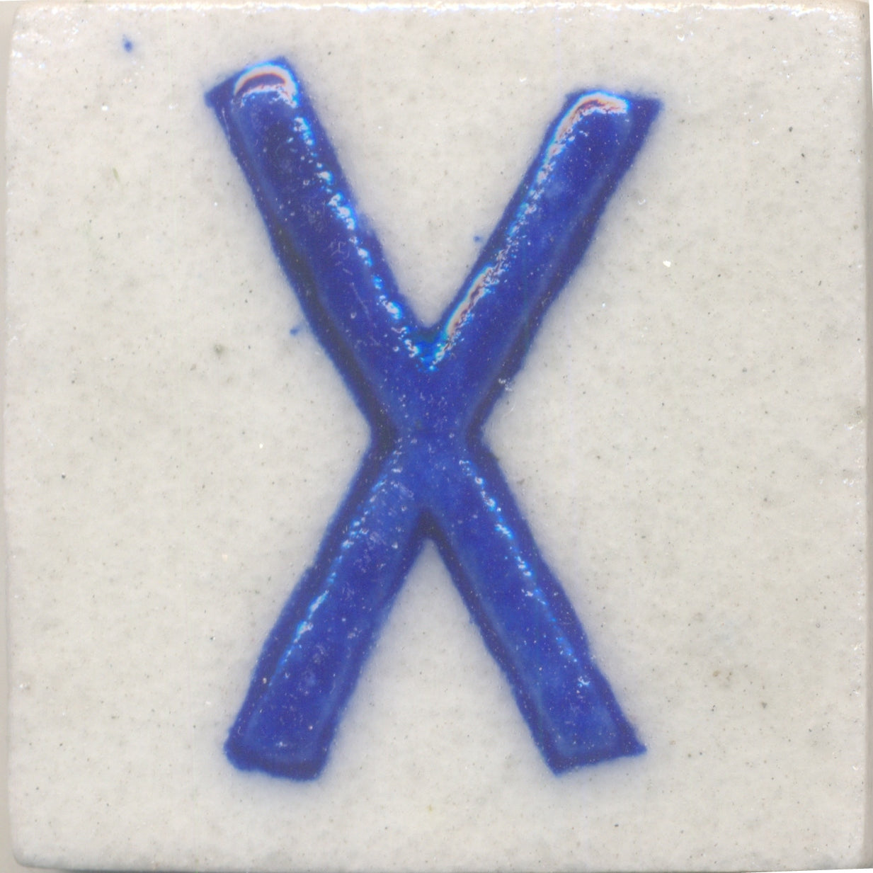 Blue X alphabet white tile.. Unique, hand painted tiles for your kitchen or other tiling project. Tile is 2x2" in size. Delivery time is normally 5 to 7 business days. If the item is out of stock, production and delivery will take 2 to 3 weeks