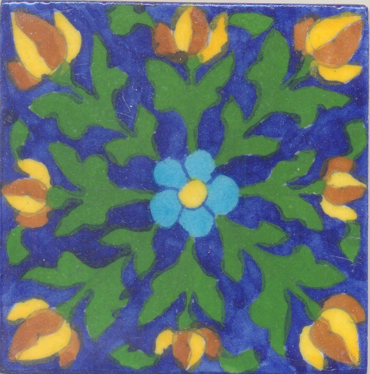 Brown,Yellow and Turquoise Flowers and Green leaf with Blue Base Tile