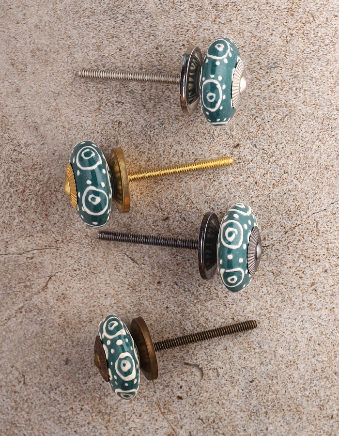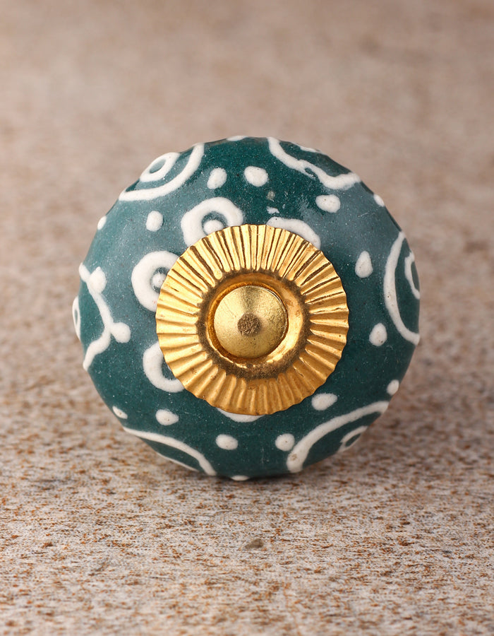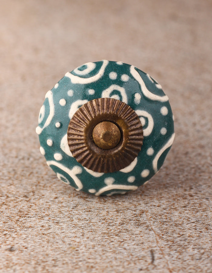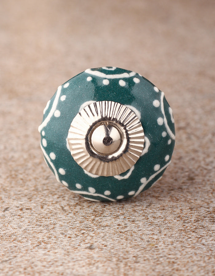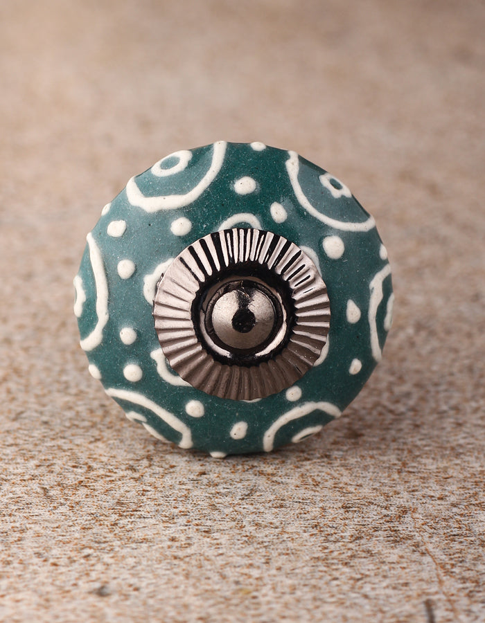 Dark Cyan Ceramic Dresser Knob With White Embossed Design