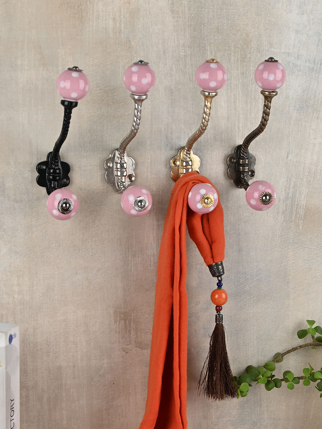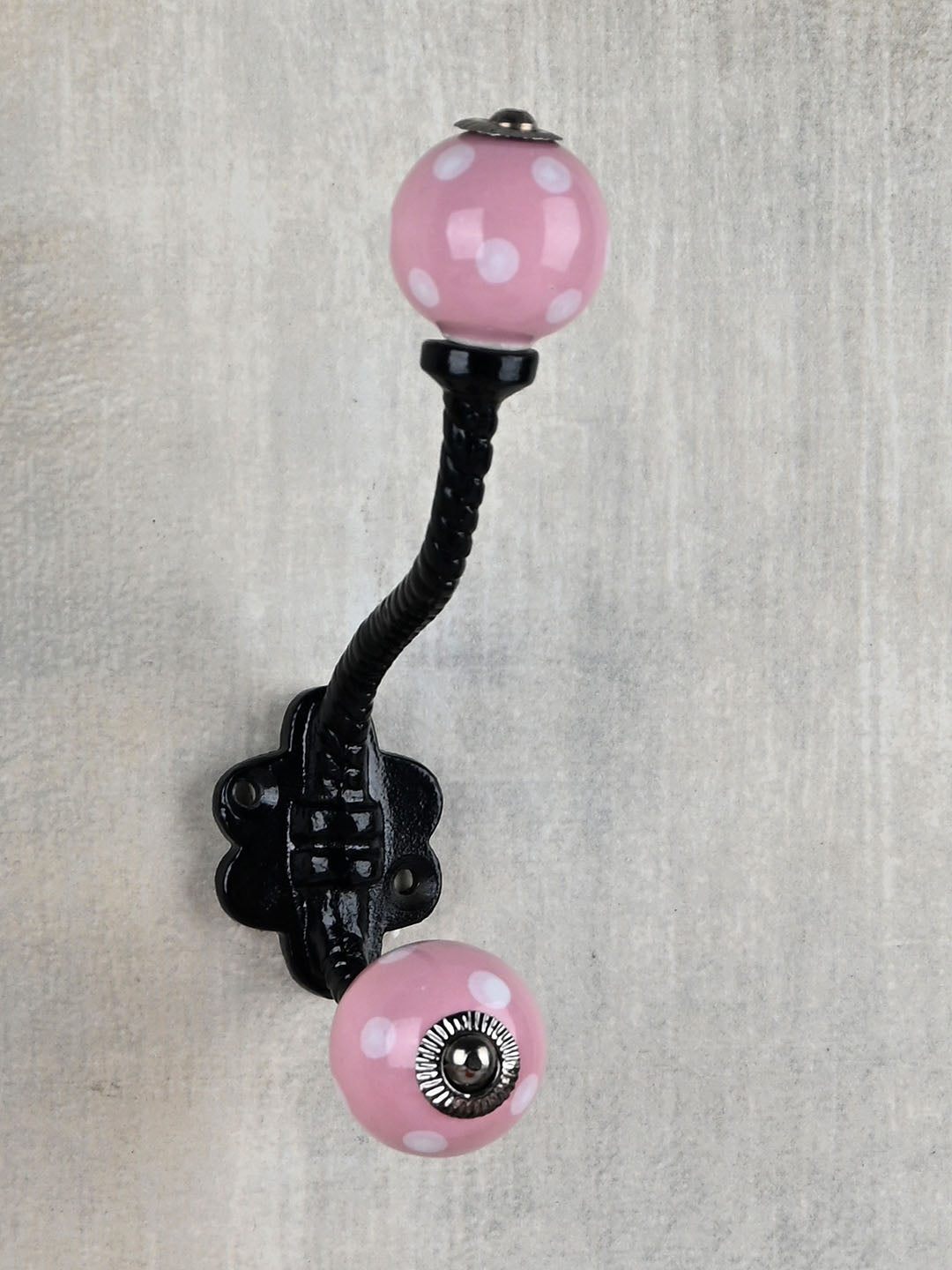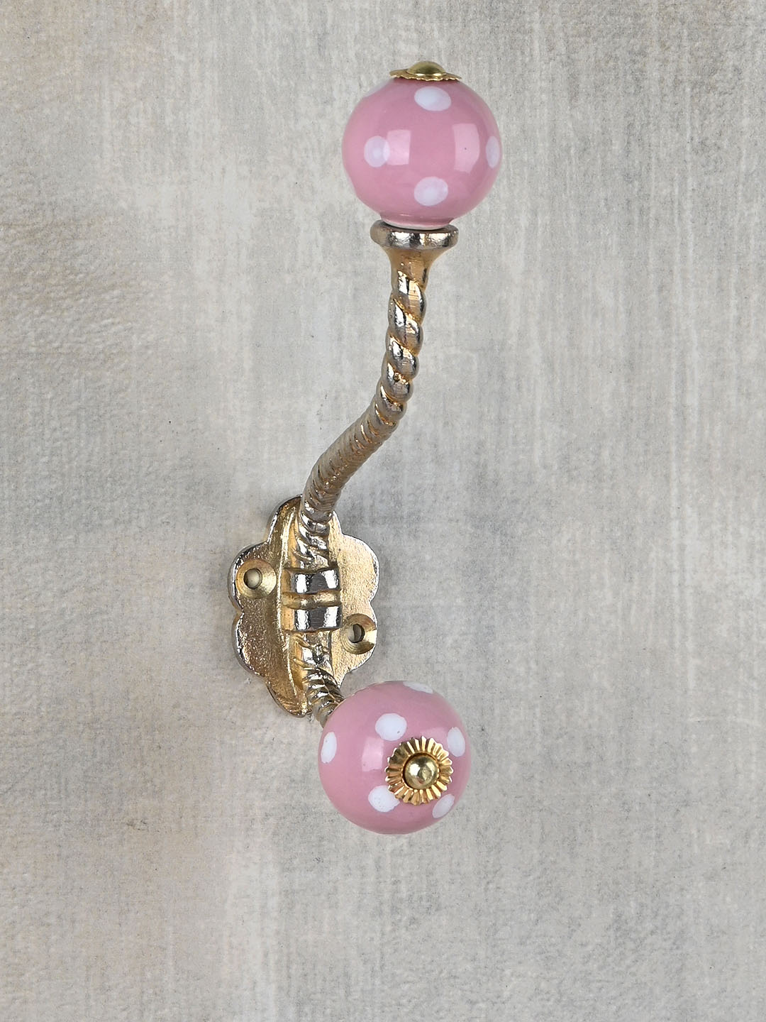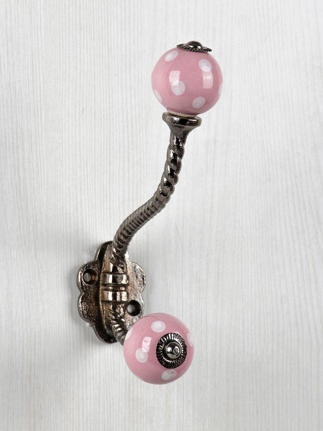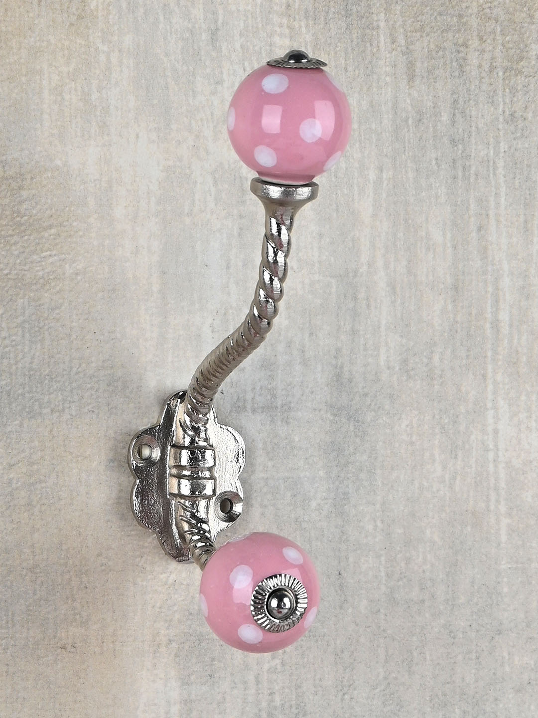 Designer Round Pink Cabinet Knob With White Polka Dots Metal Wall Hanger