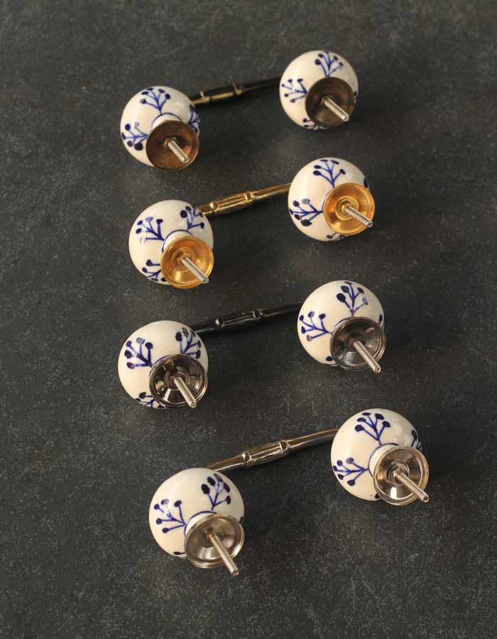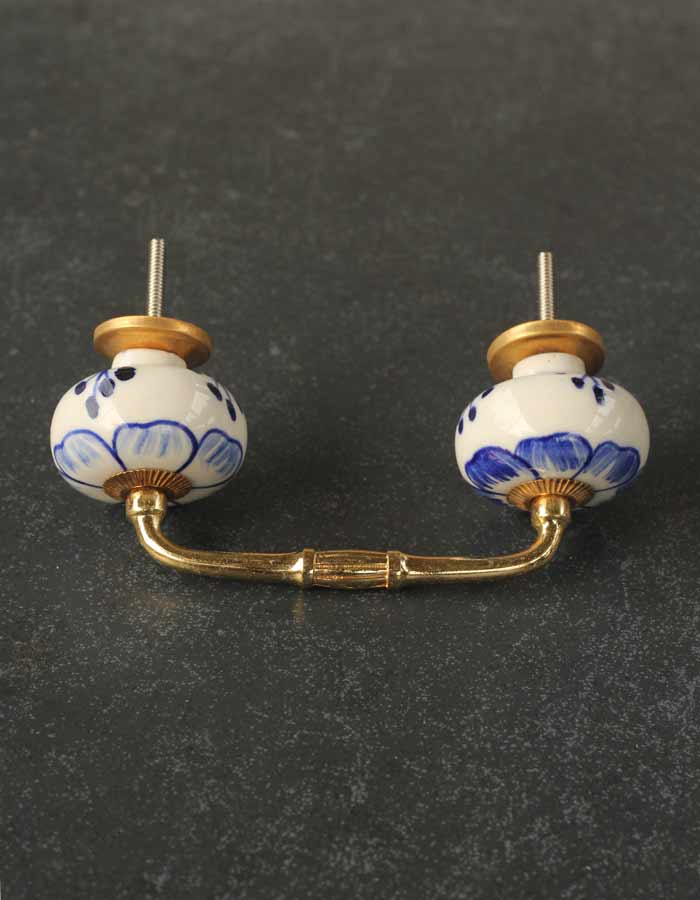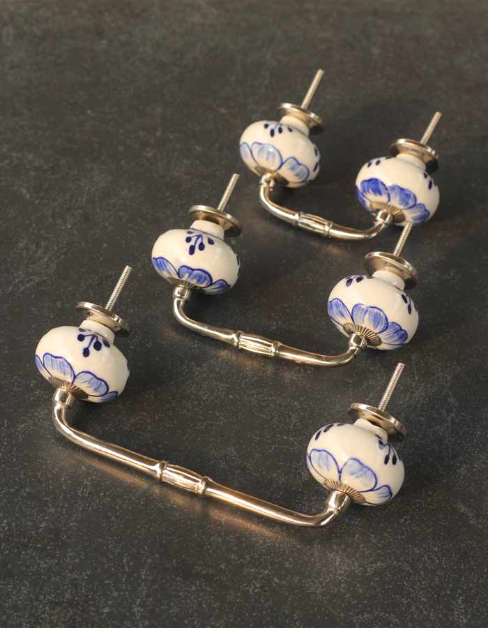 Designer White Ceramic Drawer Cabinet Pull with Blue Flower