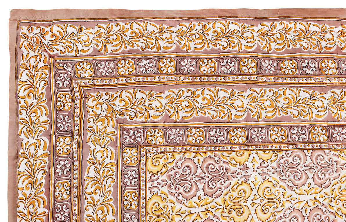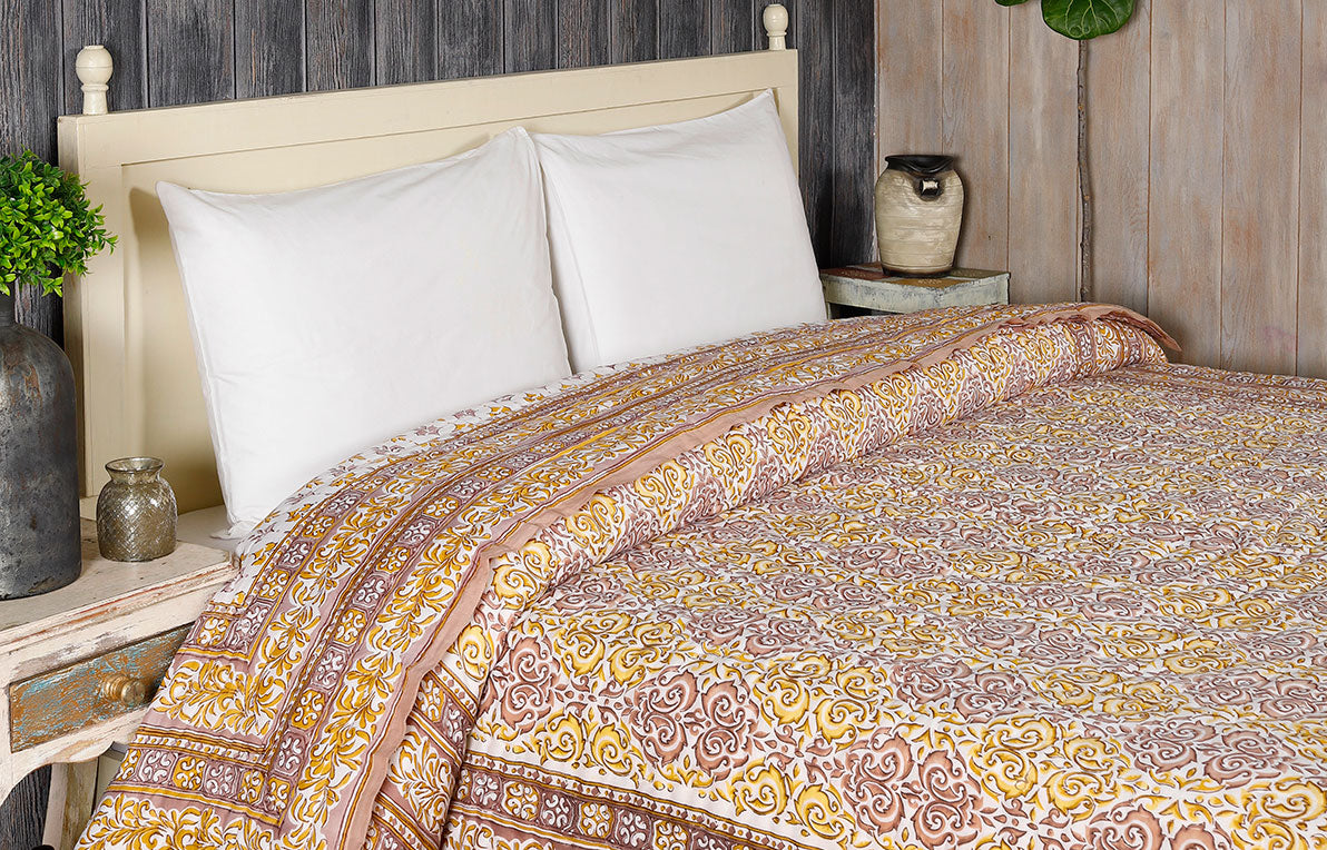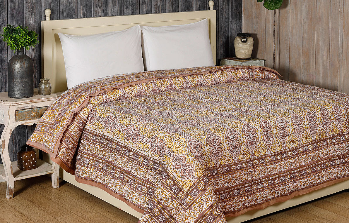 Elegance Beige and Yellow Hand Block Print Cotton Quilt