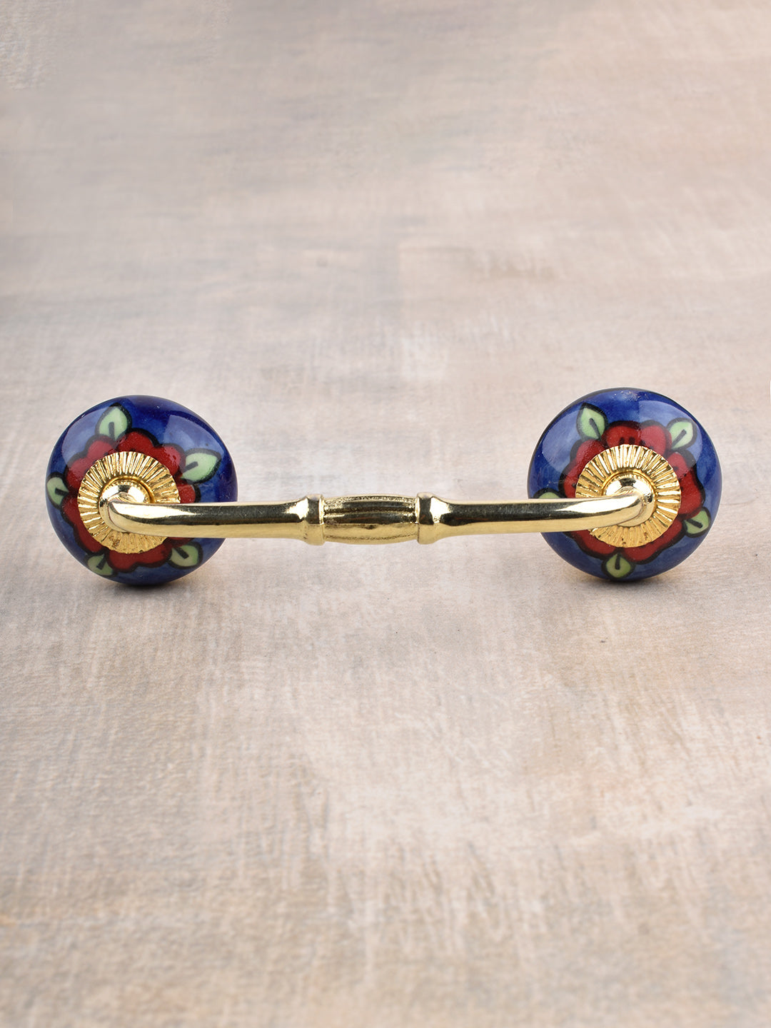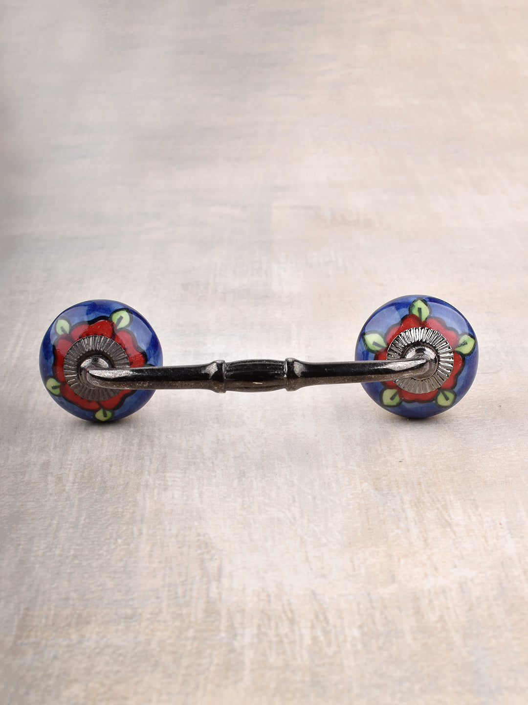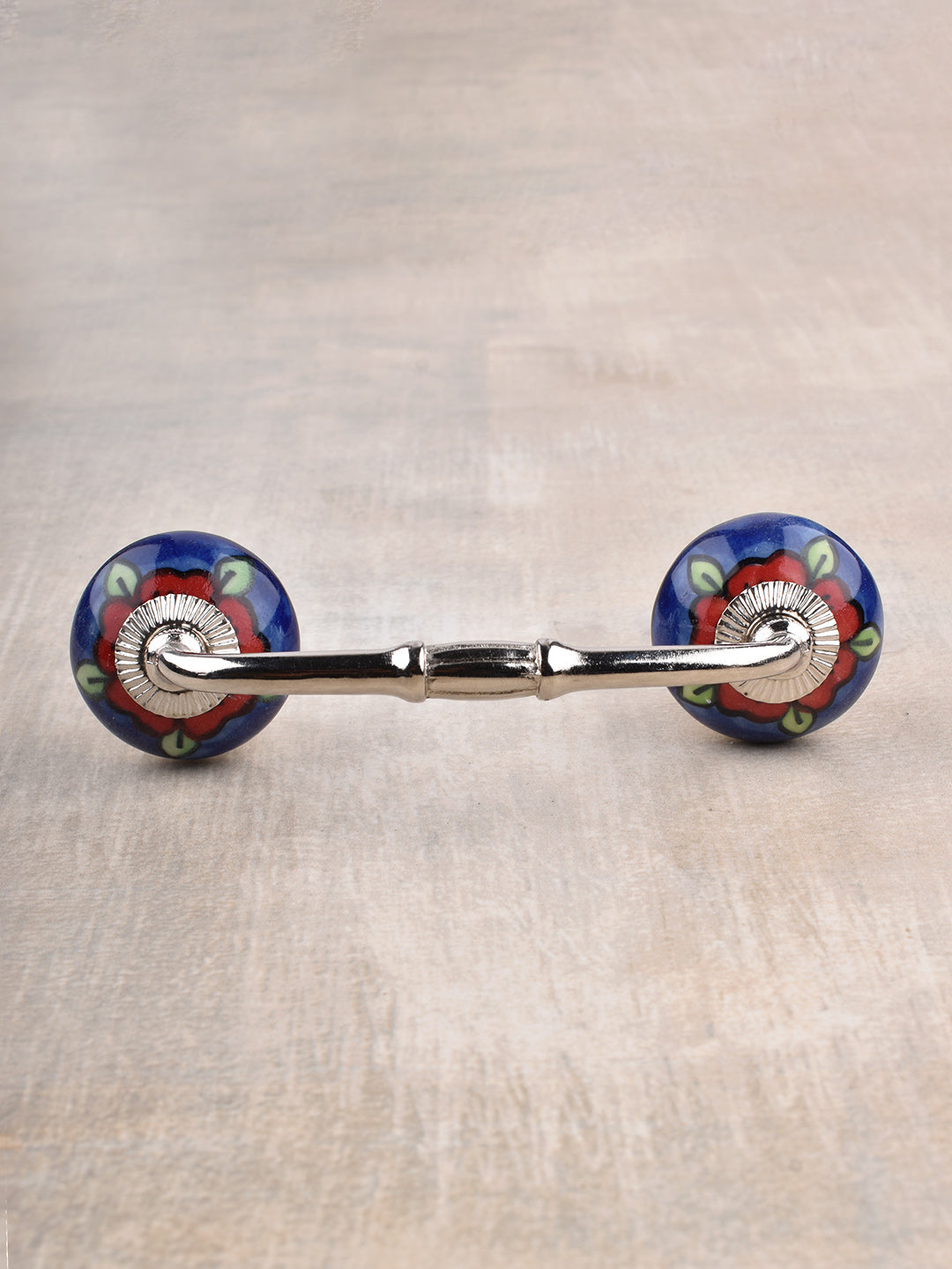 Elegant Blue Ceramic Cabinet Pull With Green Leaves And Red Flowers