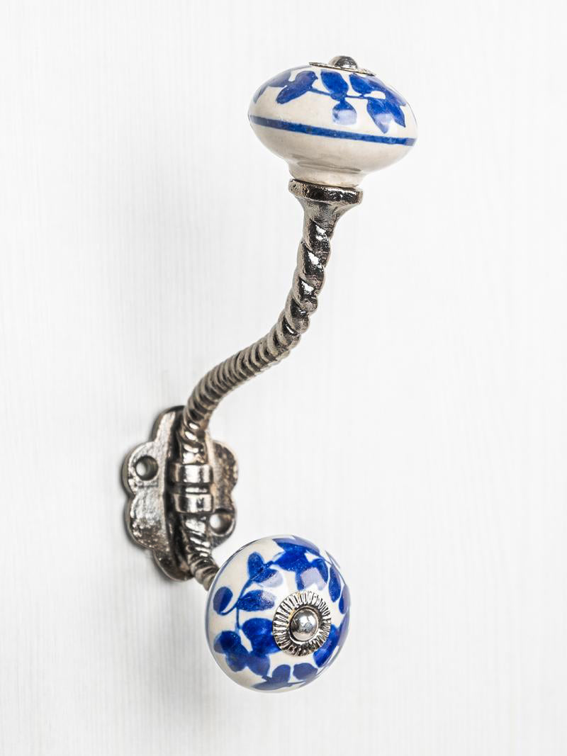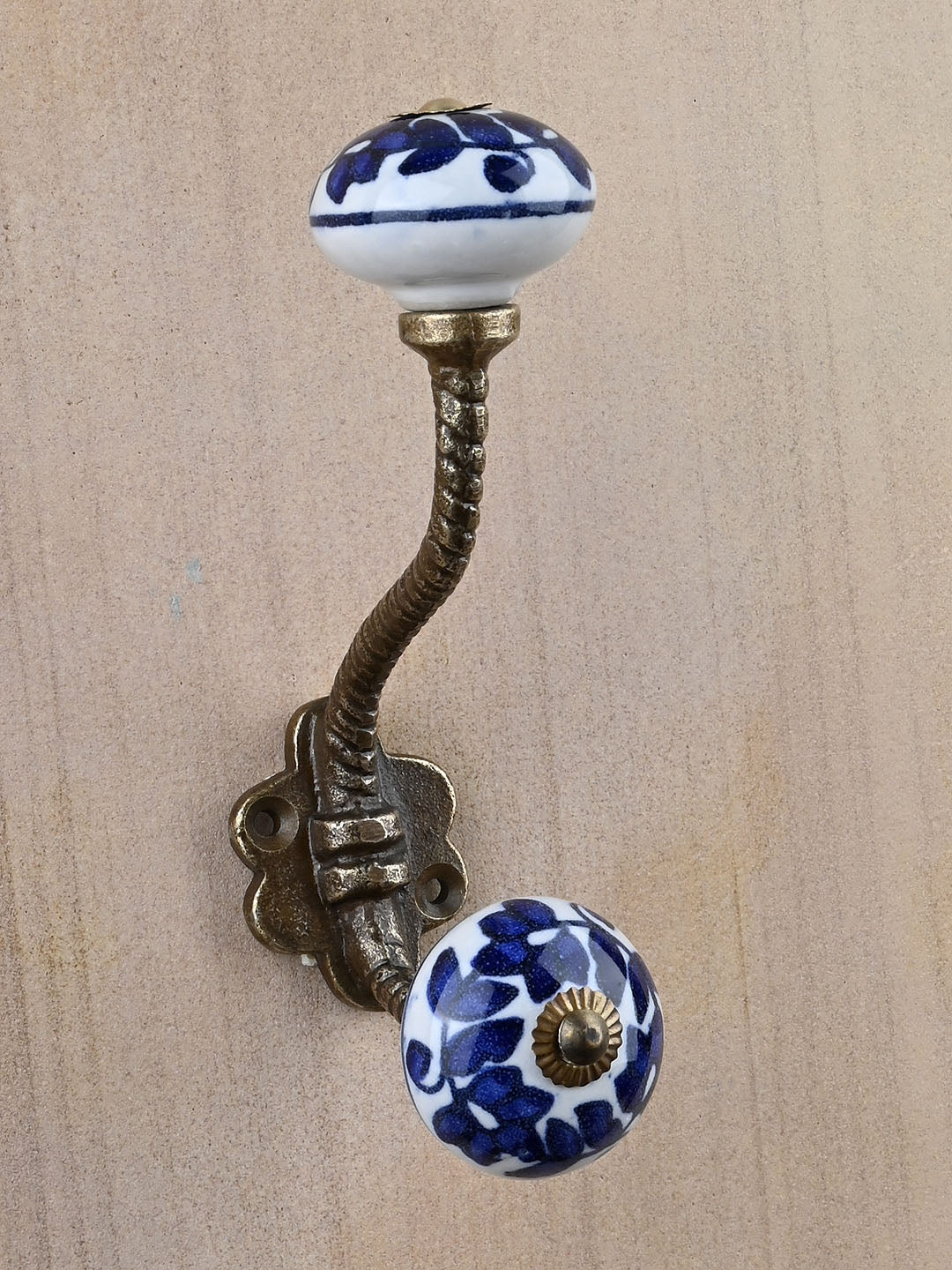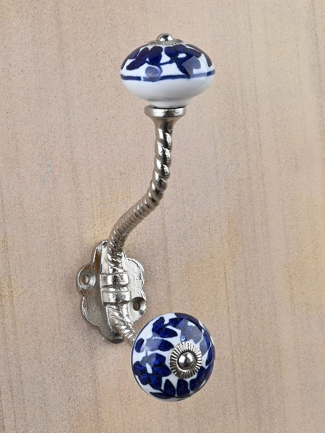 Elegant Blue Floral Pattern On White Knob With Metal Wall Hanger