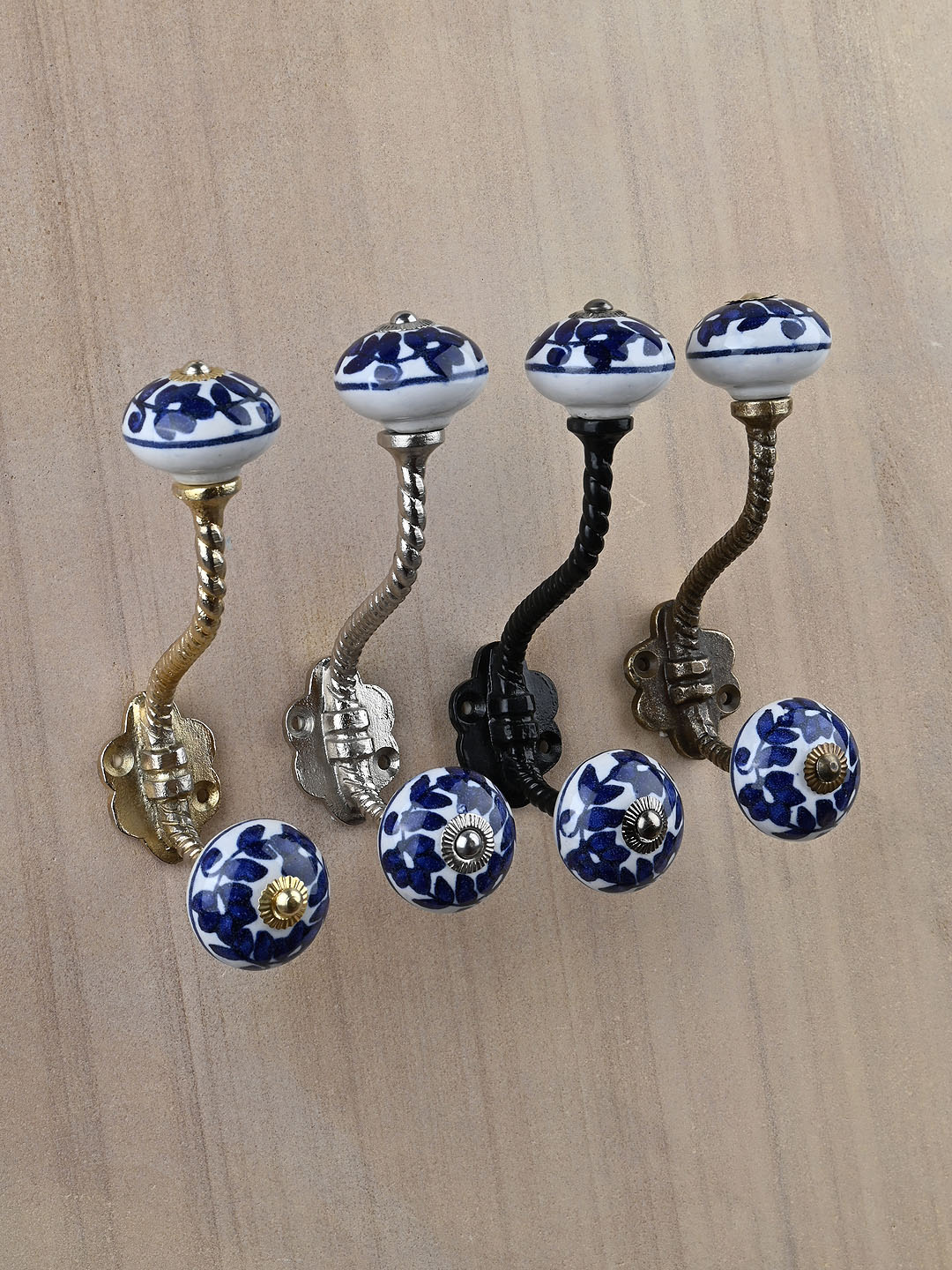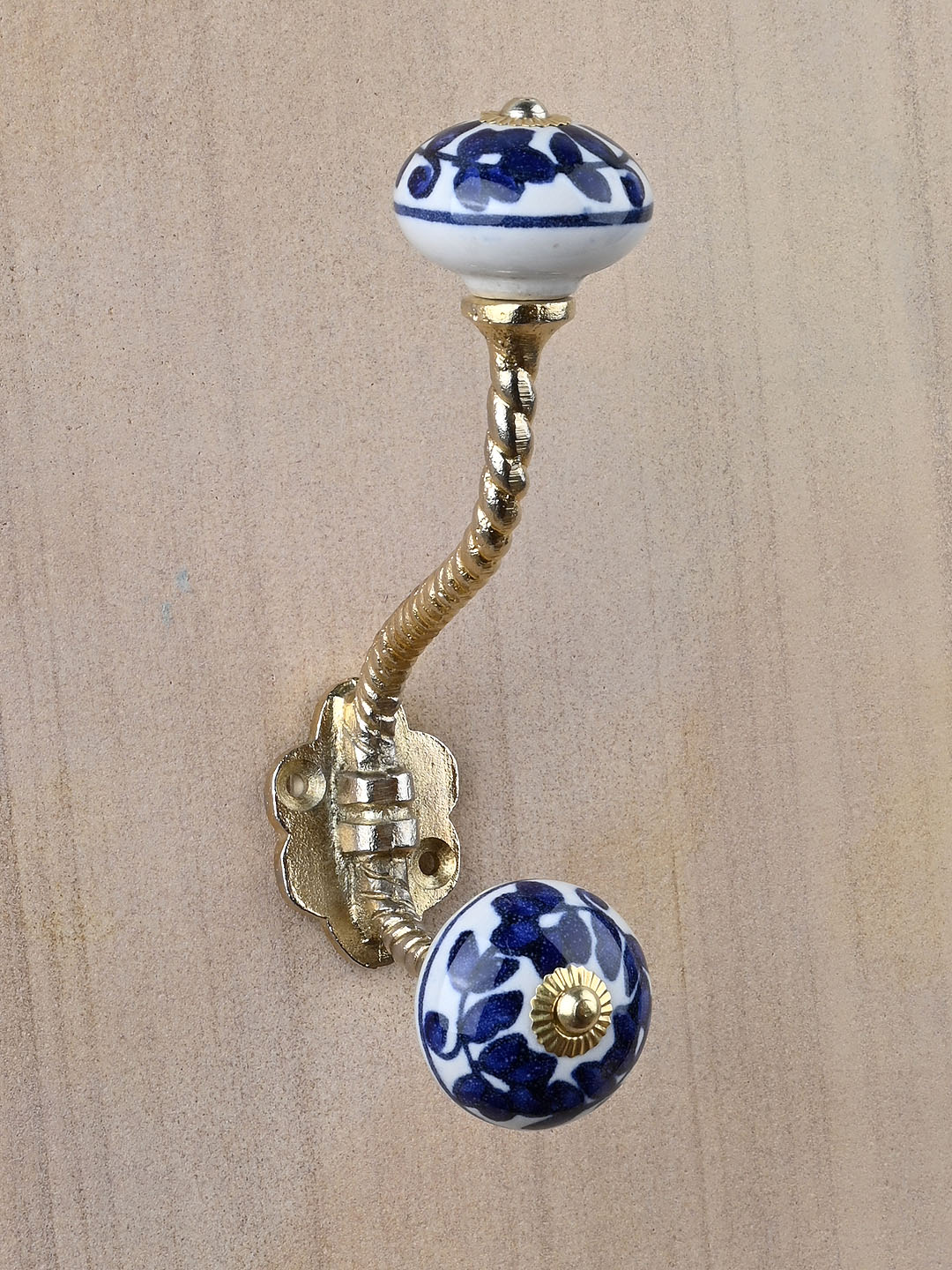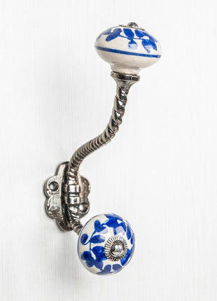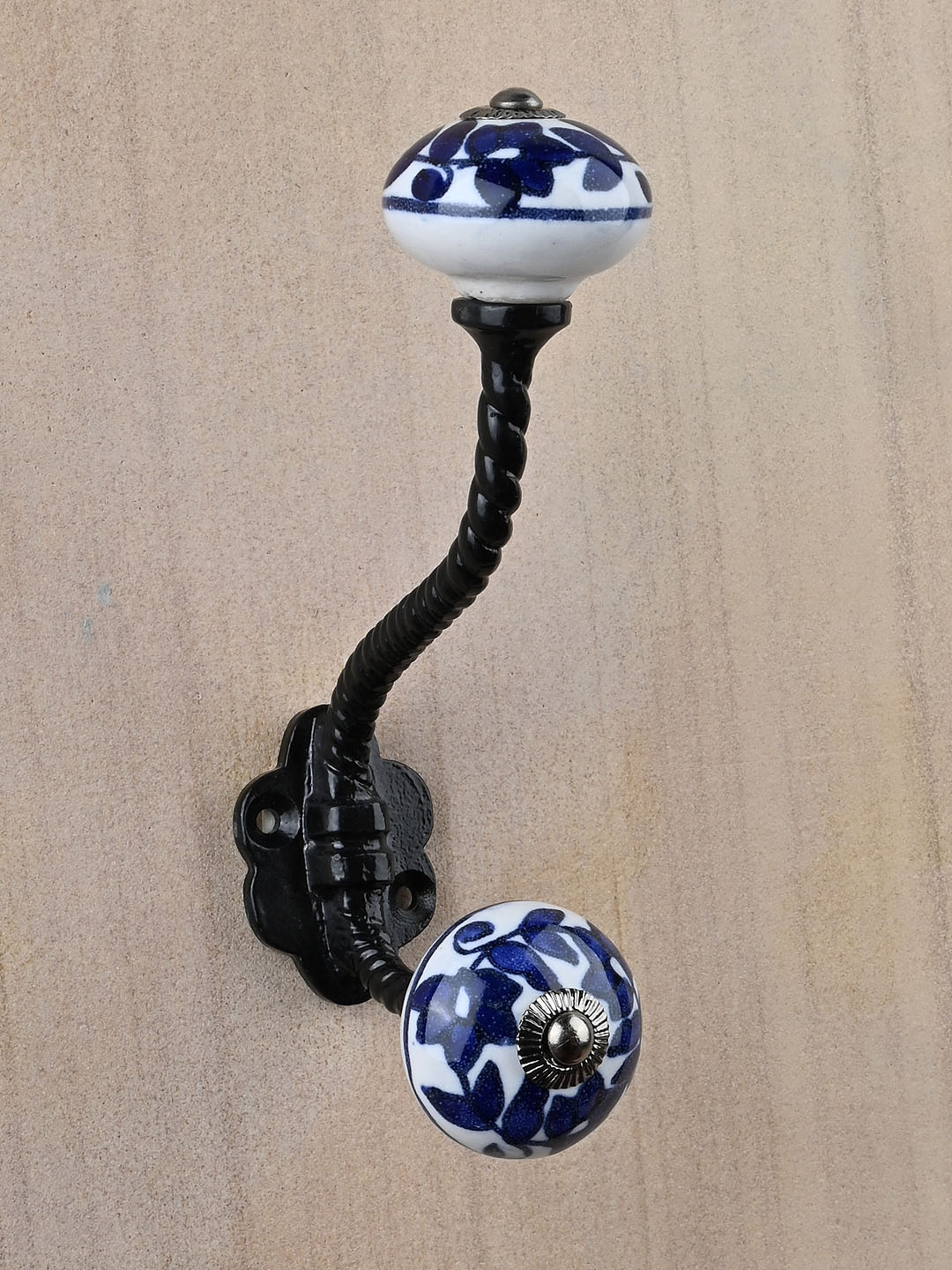 Elegant Blue Floral Pattern On White Knob With Metal Wall Hanger