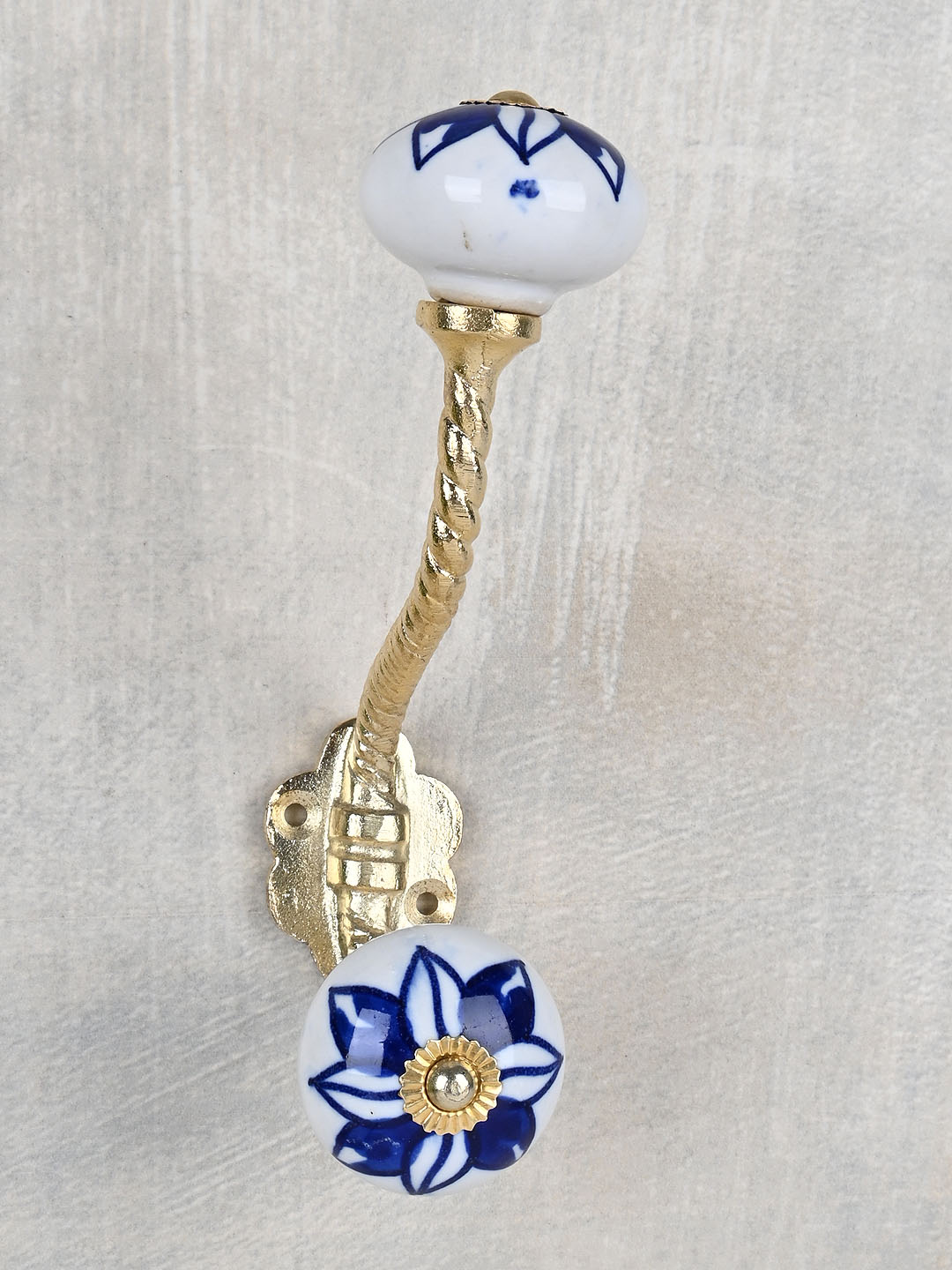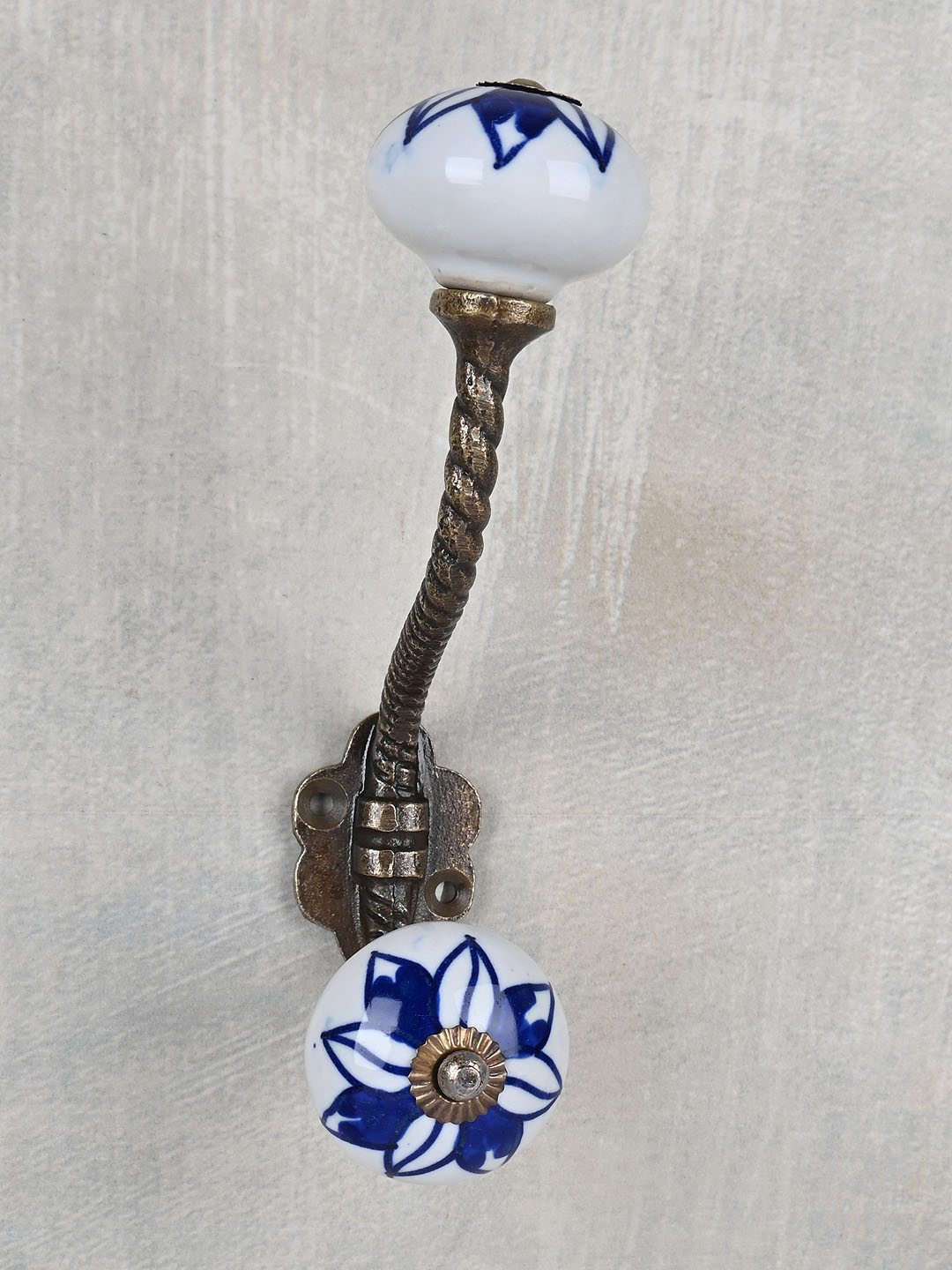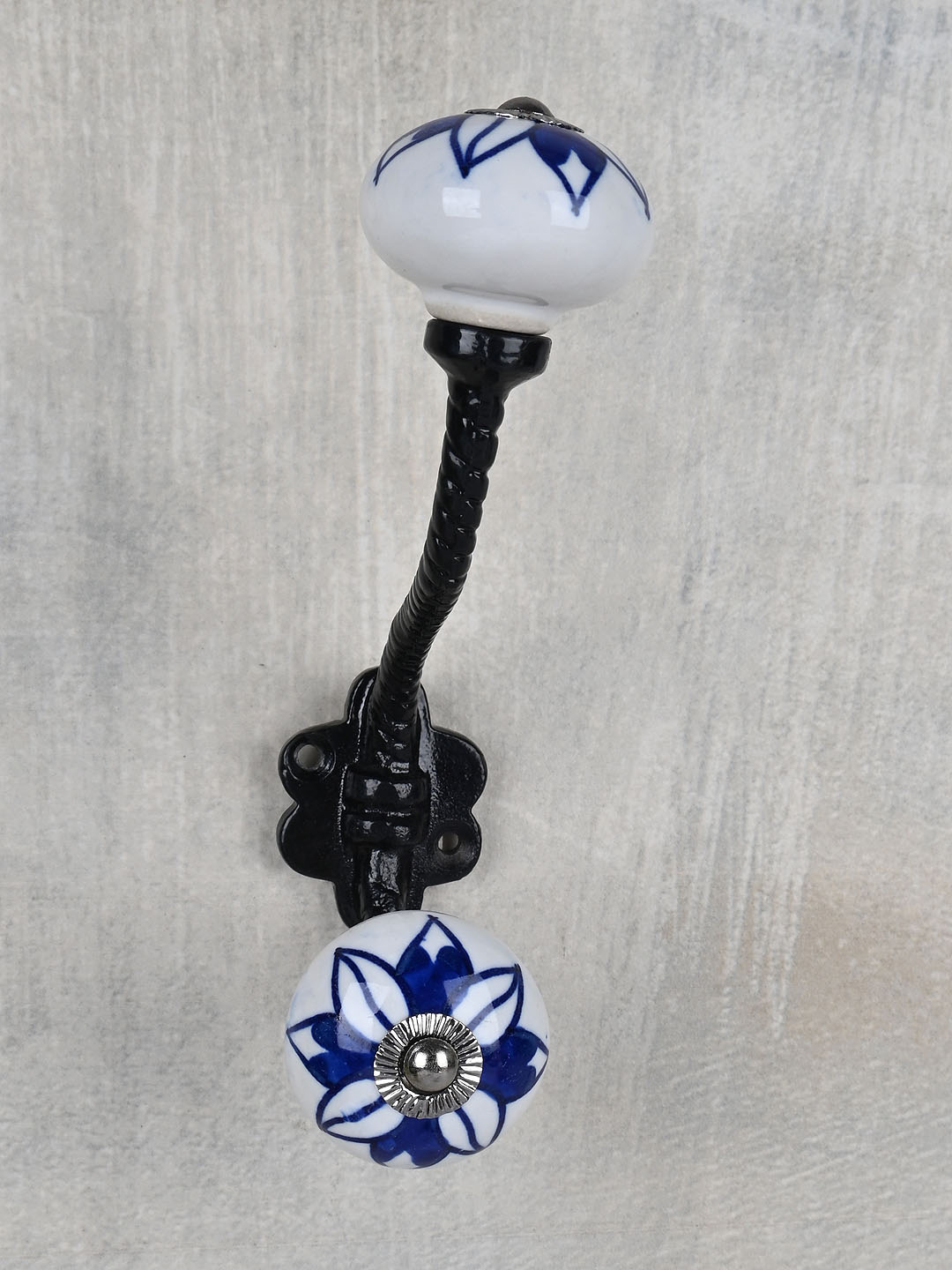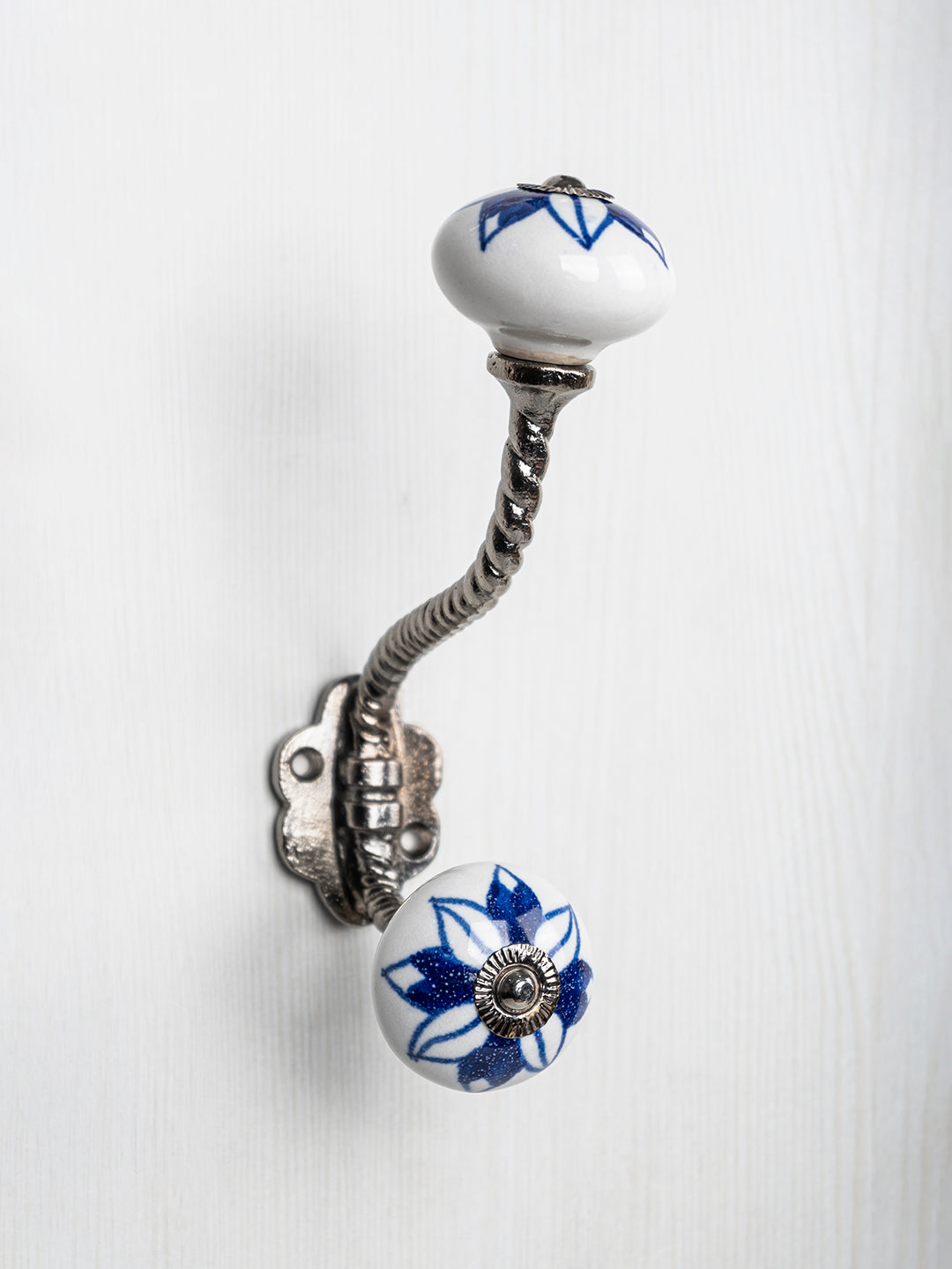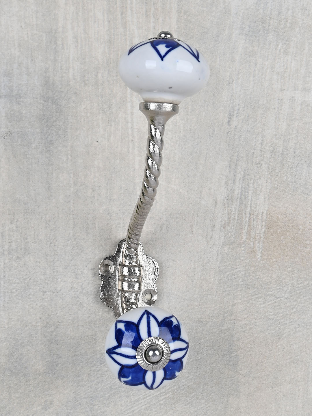 Elegant White Ceramic Knob with Blue flower With Metal Wall Hanger
