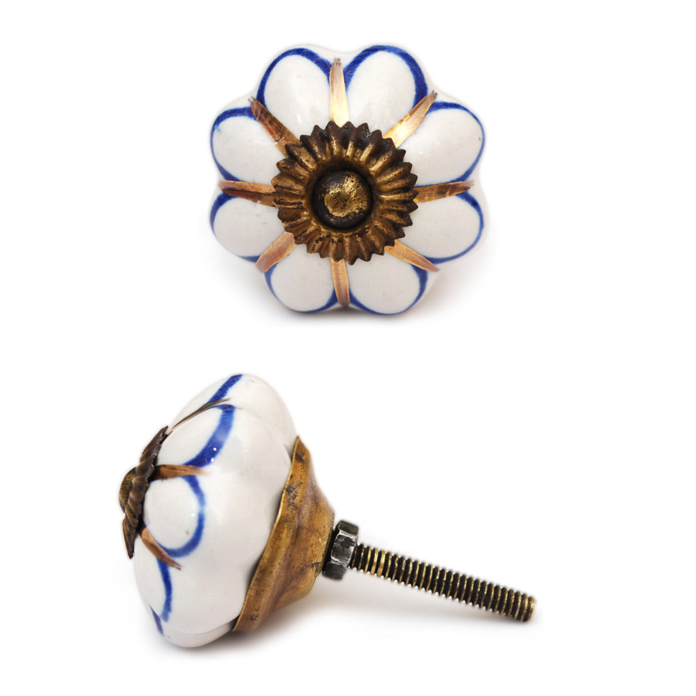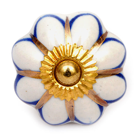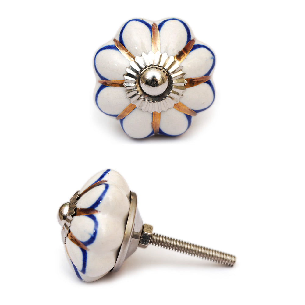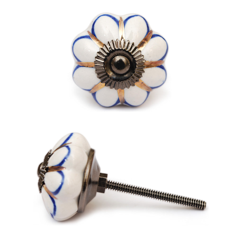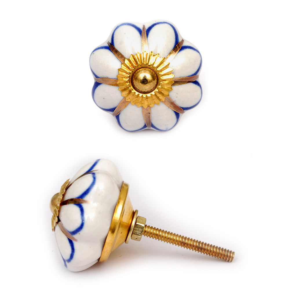 Elegant White Kitchen Cabinet Knob With Blue And Golden Design