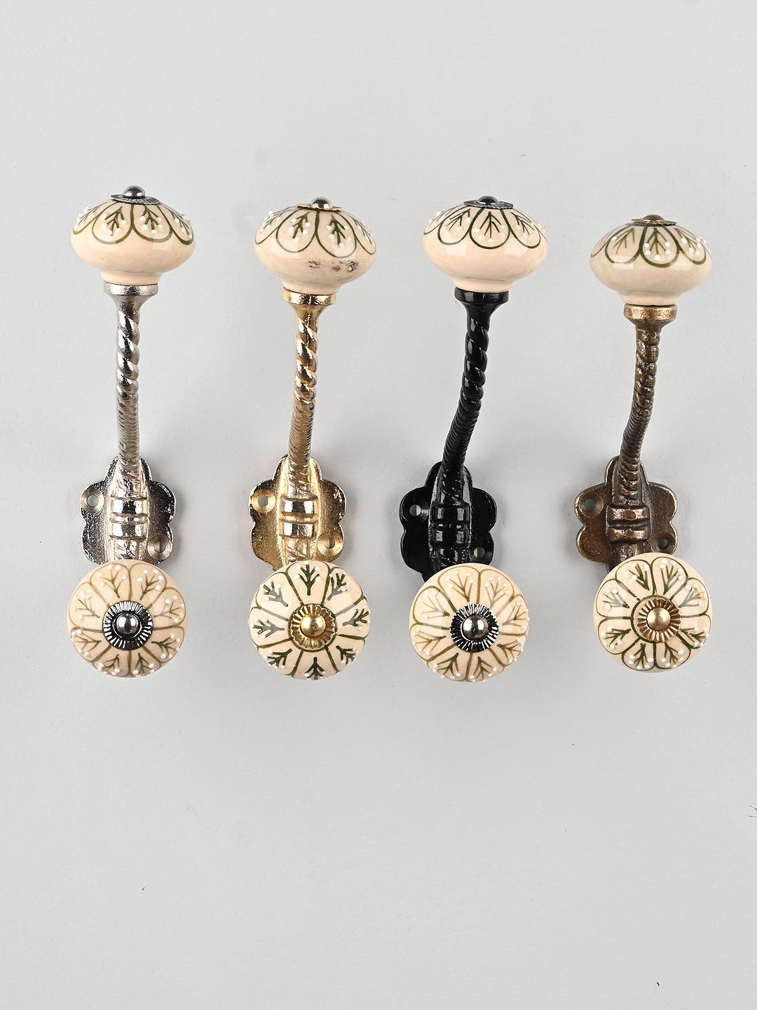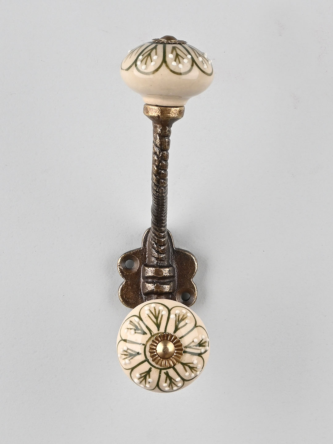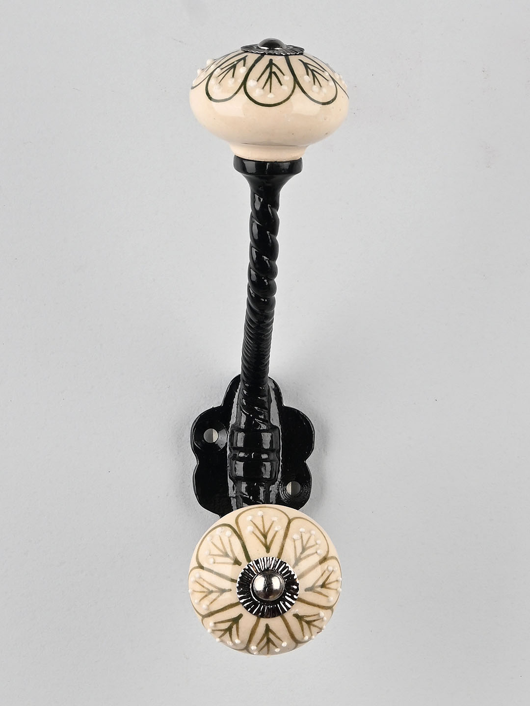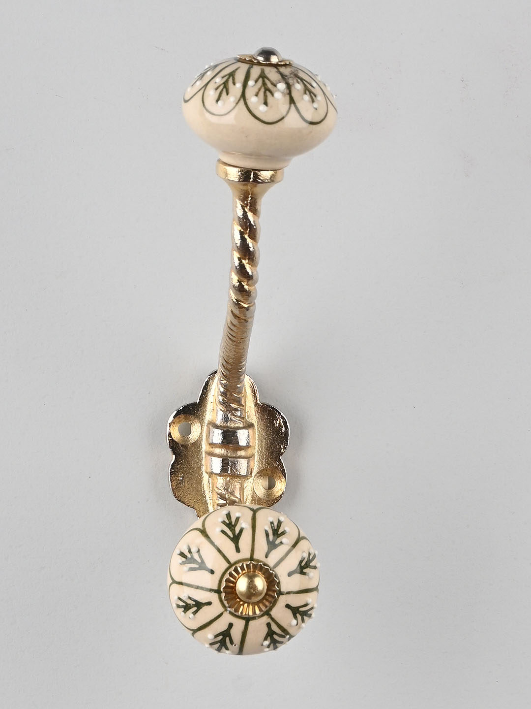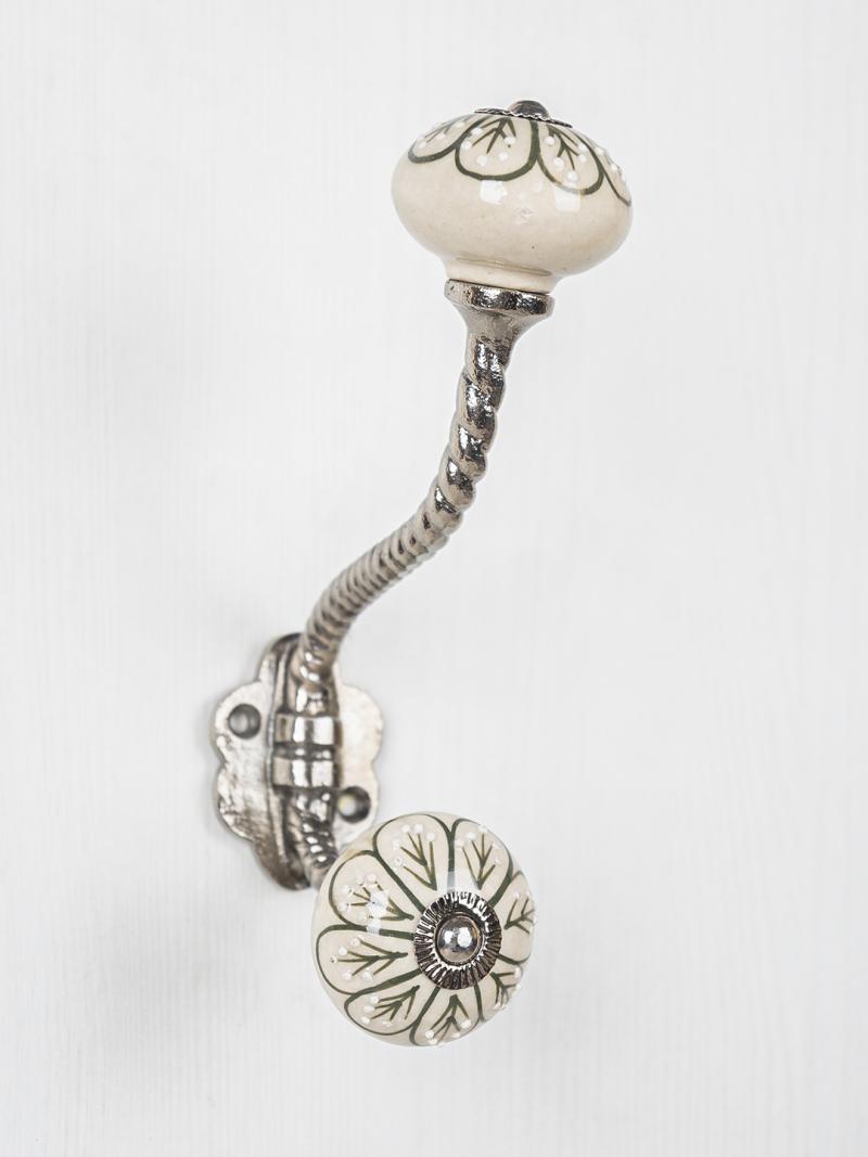 Embossed Flower Design with Green Color on Off white Base Knob With Metal Wall Hanger