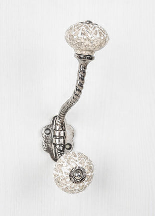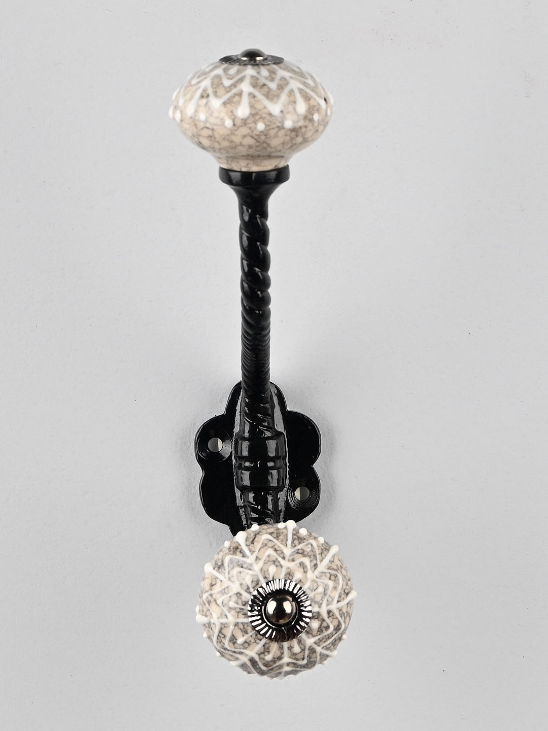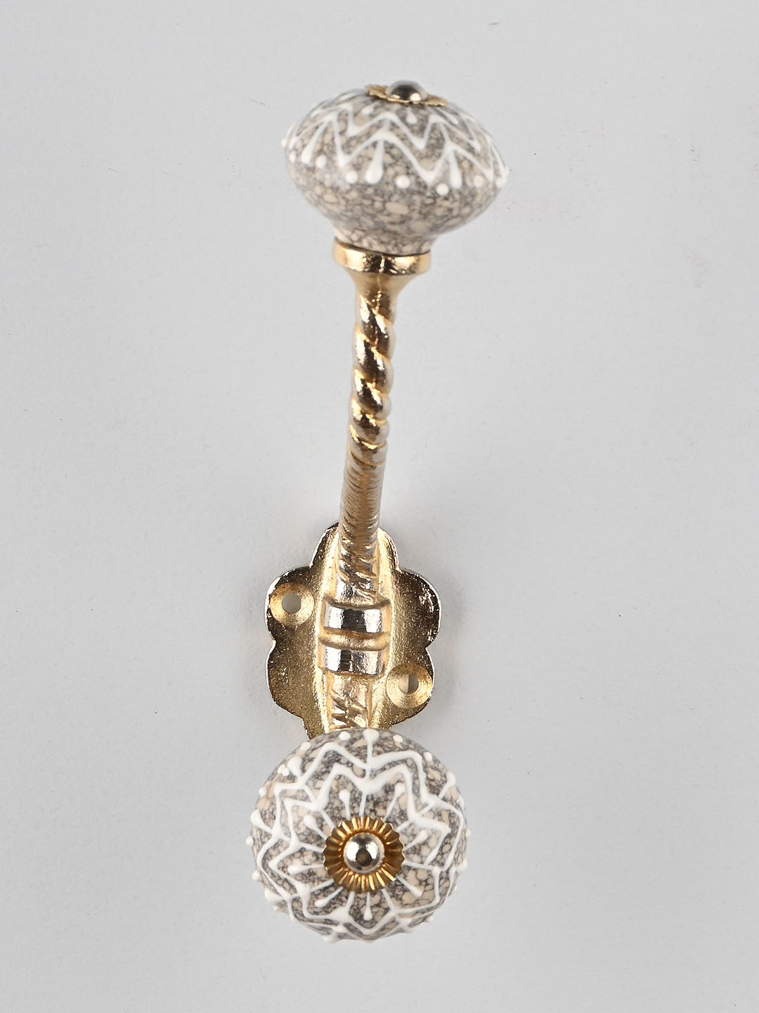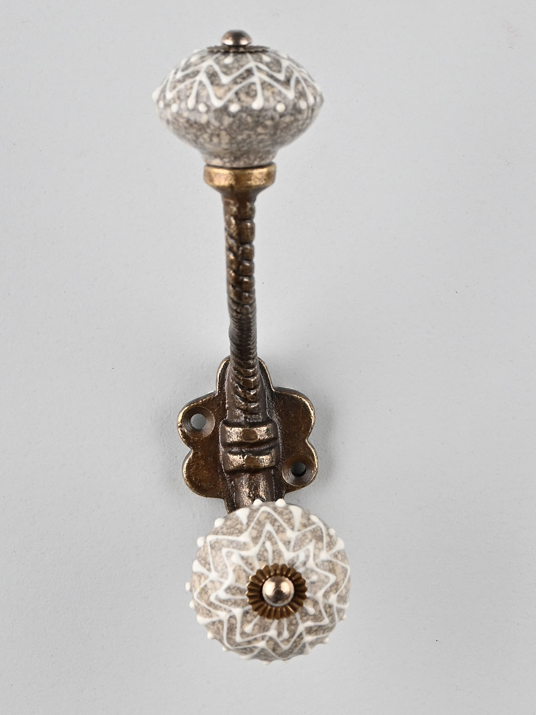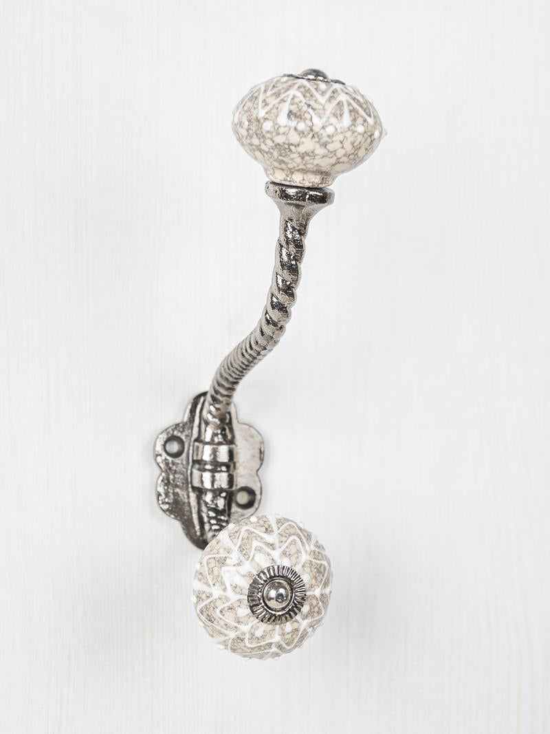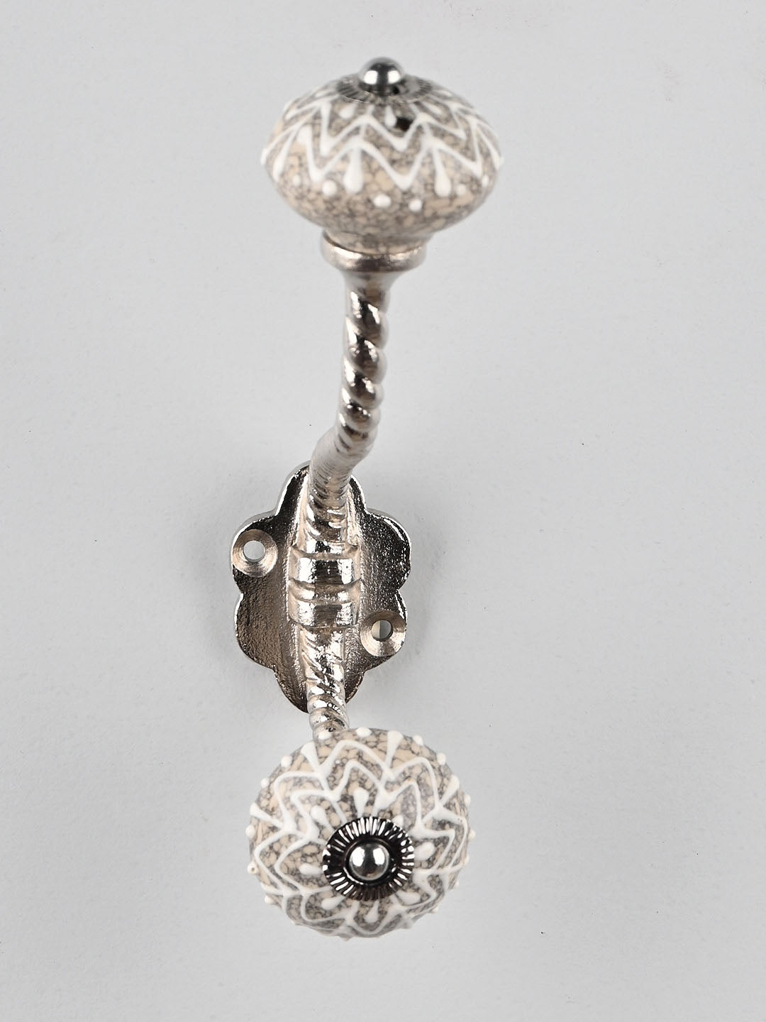 Embossed White Design on Light Gray Base Knob With Metal Wall Hanger