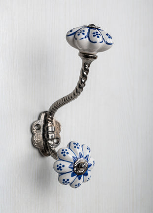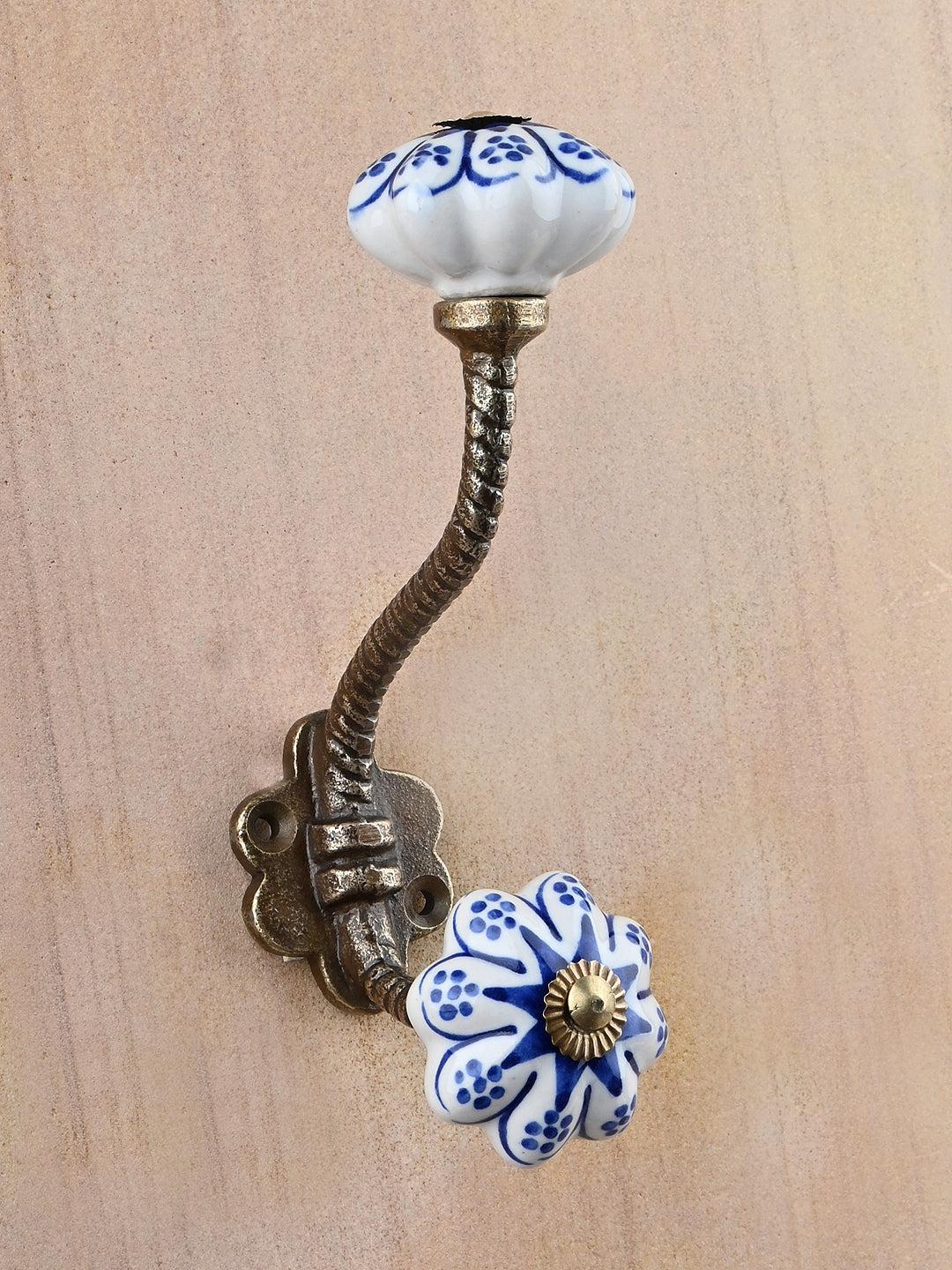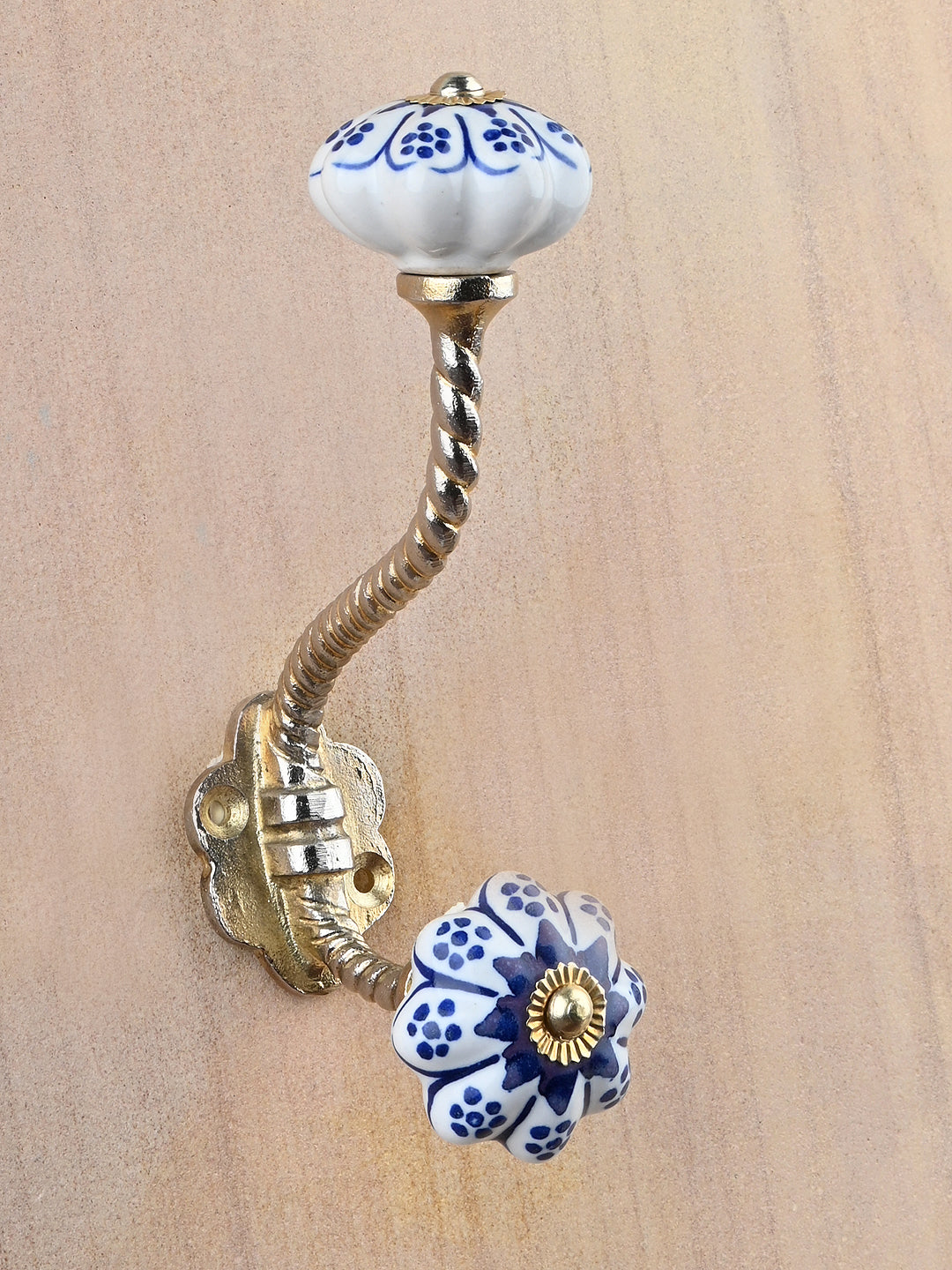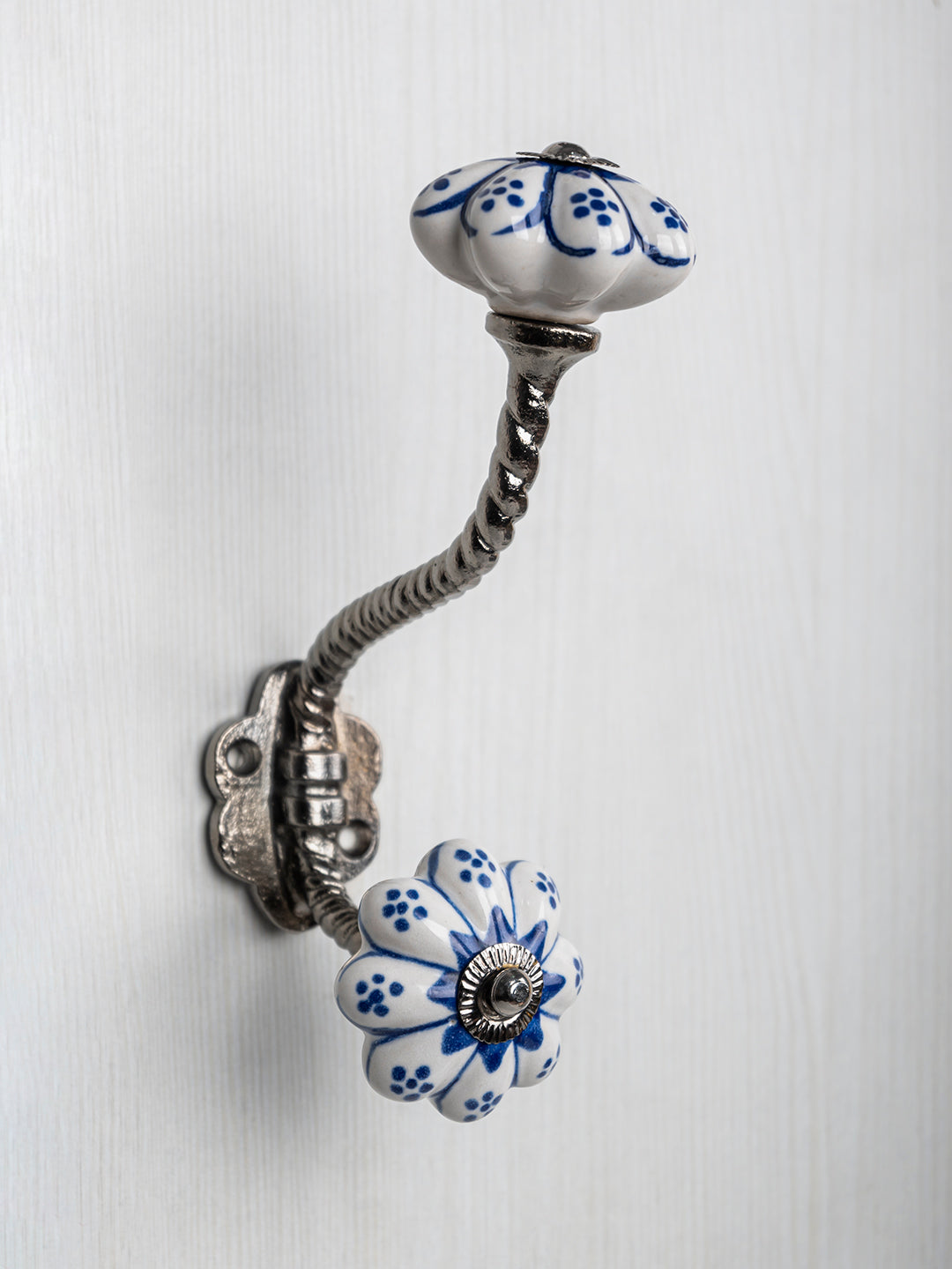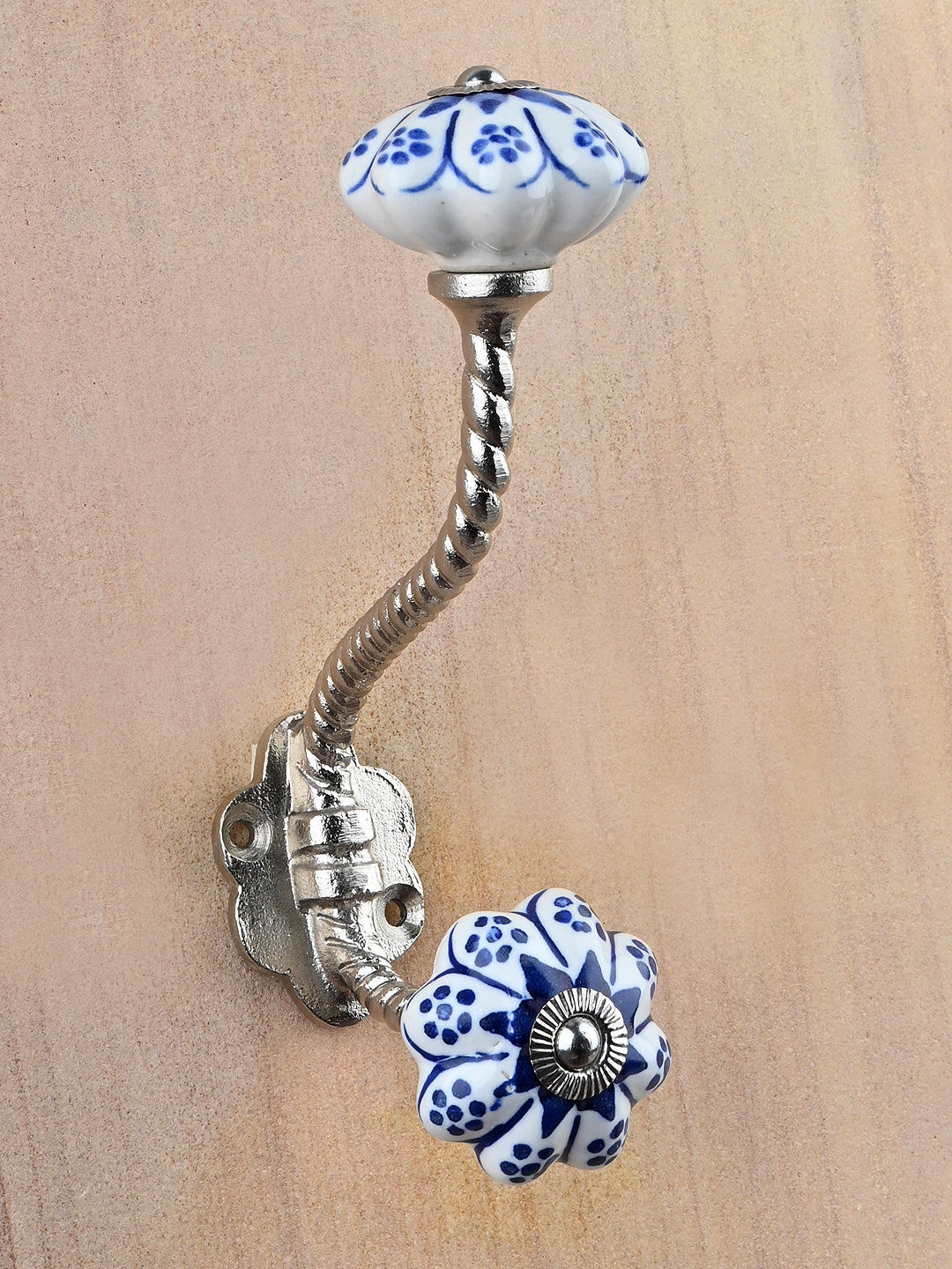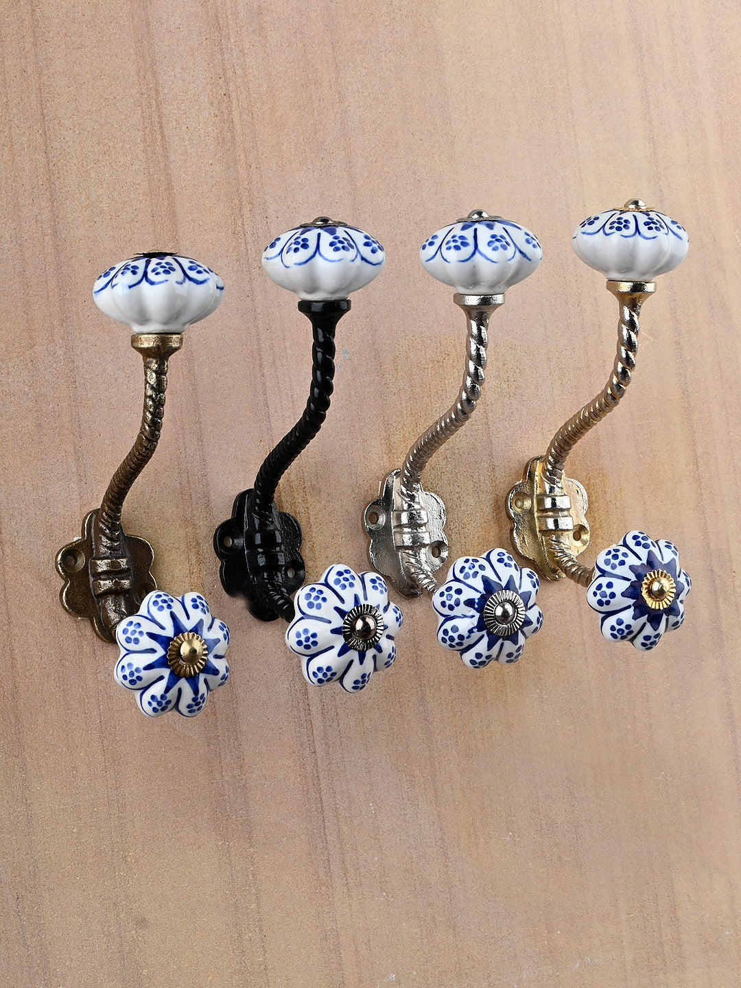 Flower Shaped Blue Design Ceramic Cabinet Knob With Metal Wall Hanger