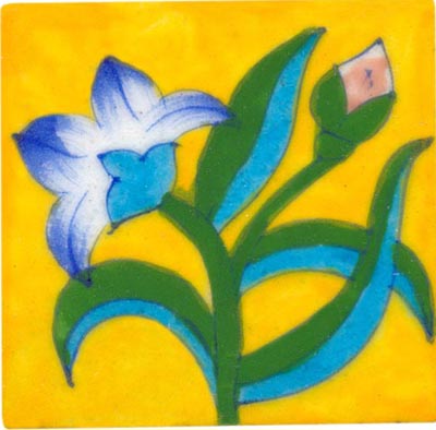 green and turquoise leaves with blue shaded flower on yellow tile 3x3