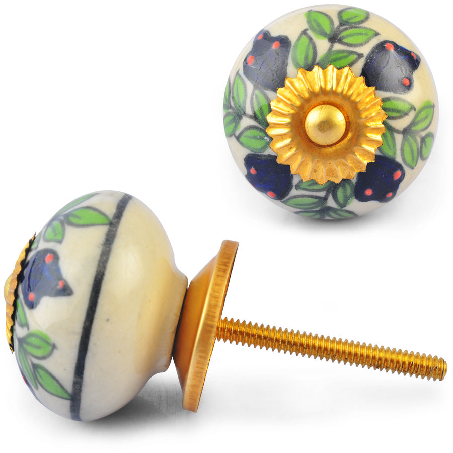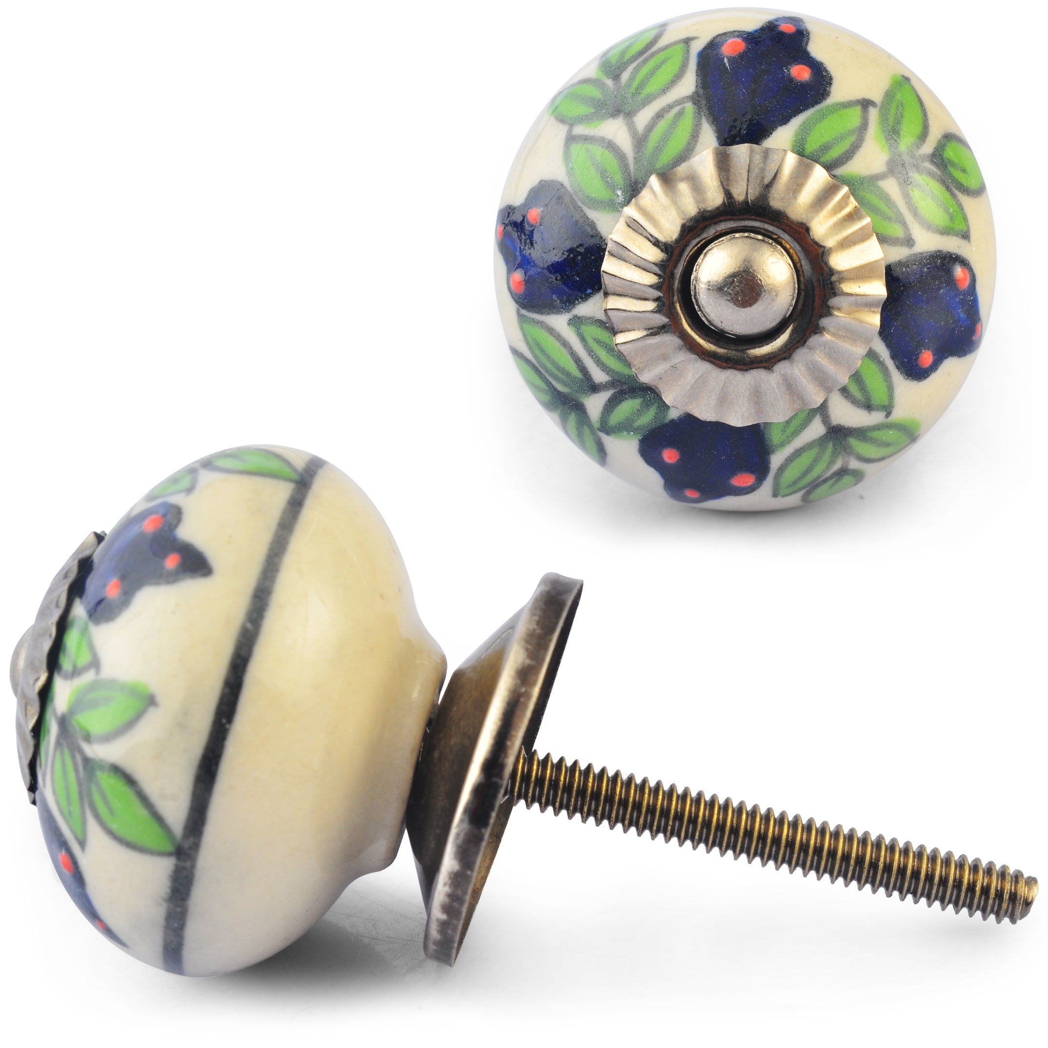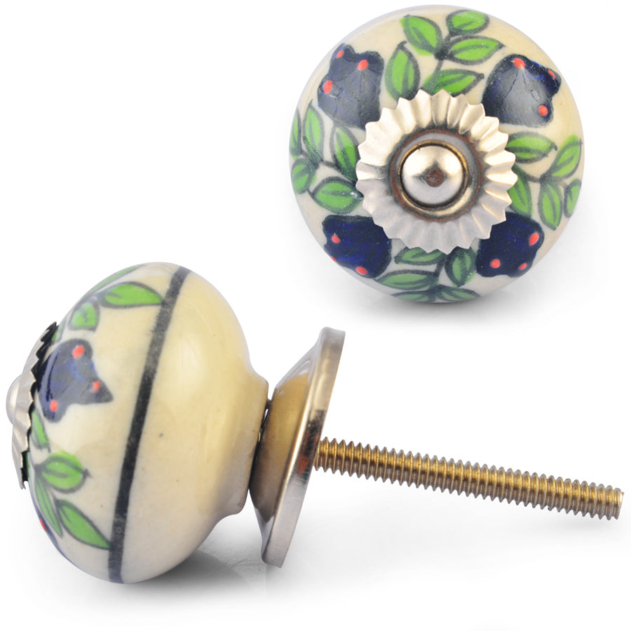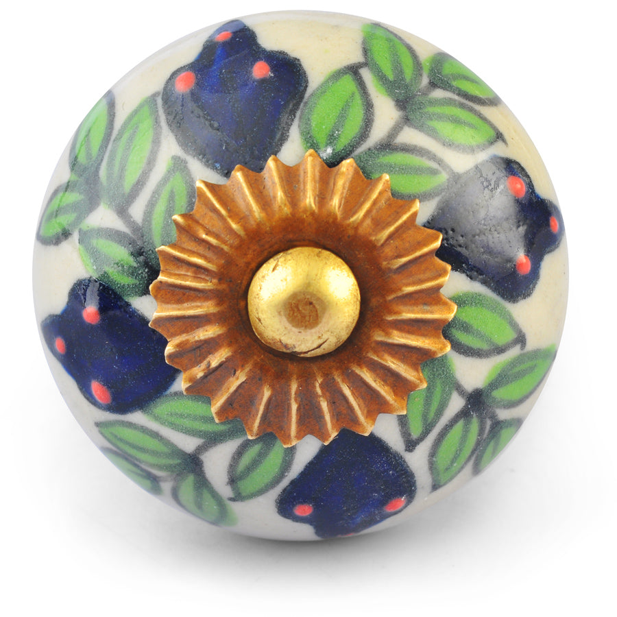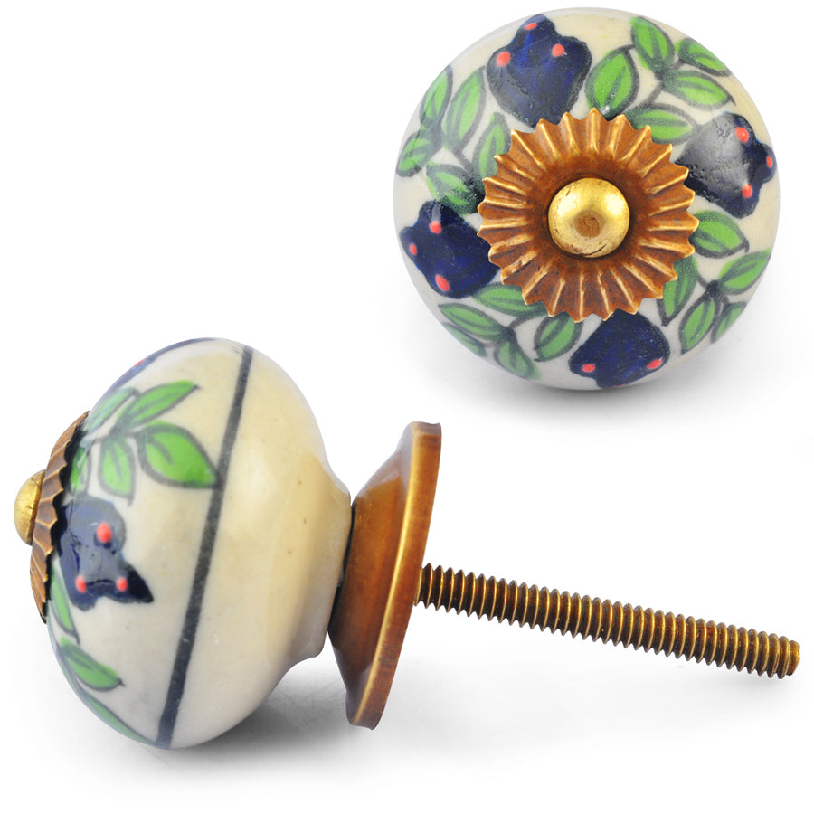 Green leaves and Blue Flowers on White Base Ceramic knob