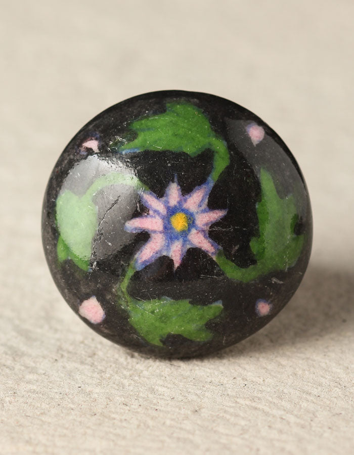Handmade Black Ceramic Knob With Green Leaf Design, has sophisticated design and is beautifully and neatly crafted to suit your requirement of a floral knob for the drawers and cabinets at your home.