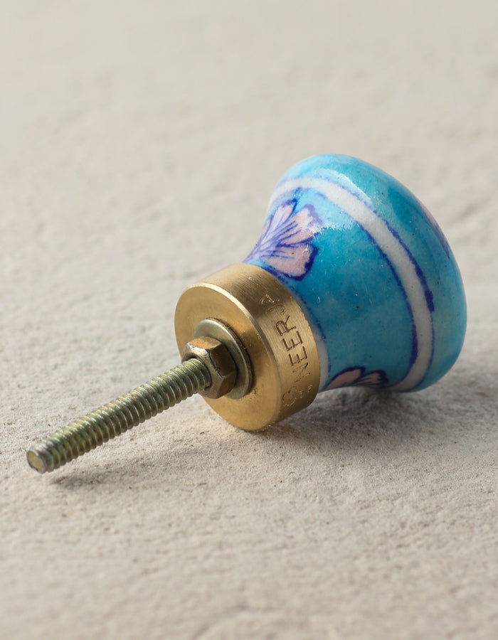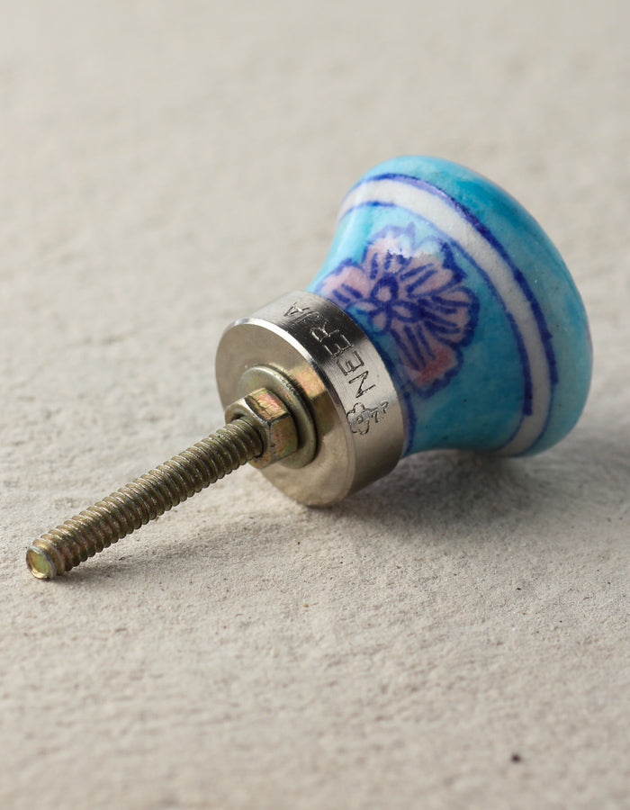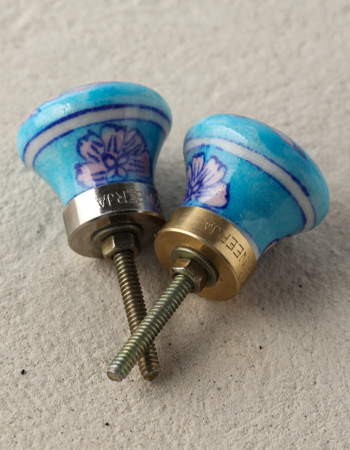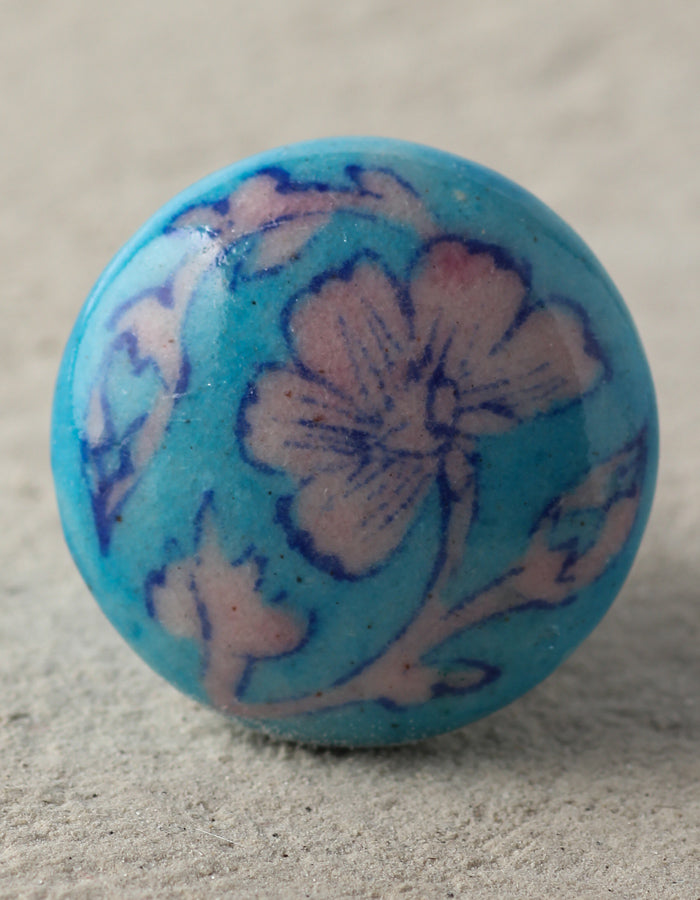 Handmade Pink Flower On Turquoise Ceramic Blue Pottery Drawer Knob