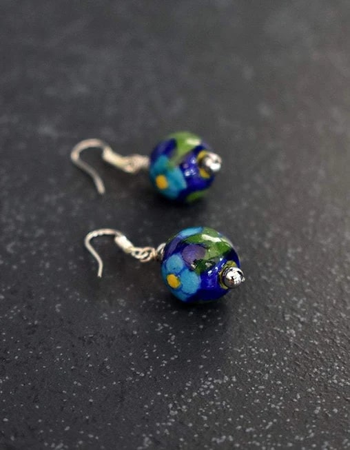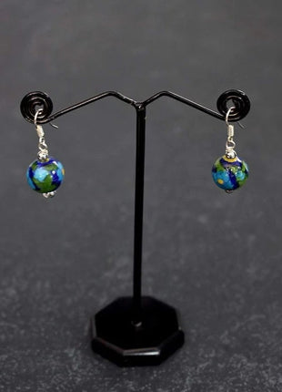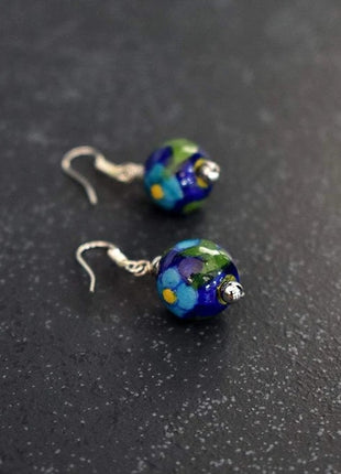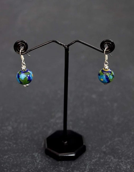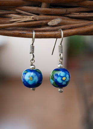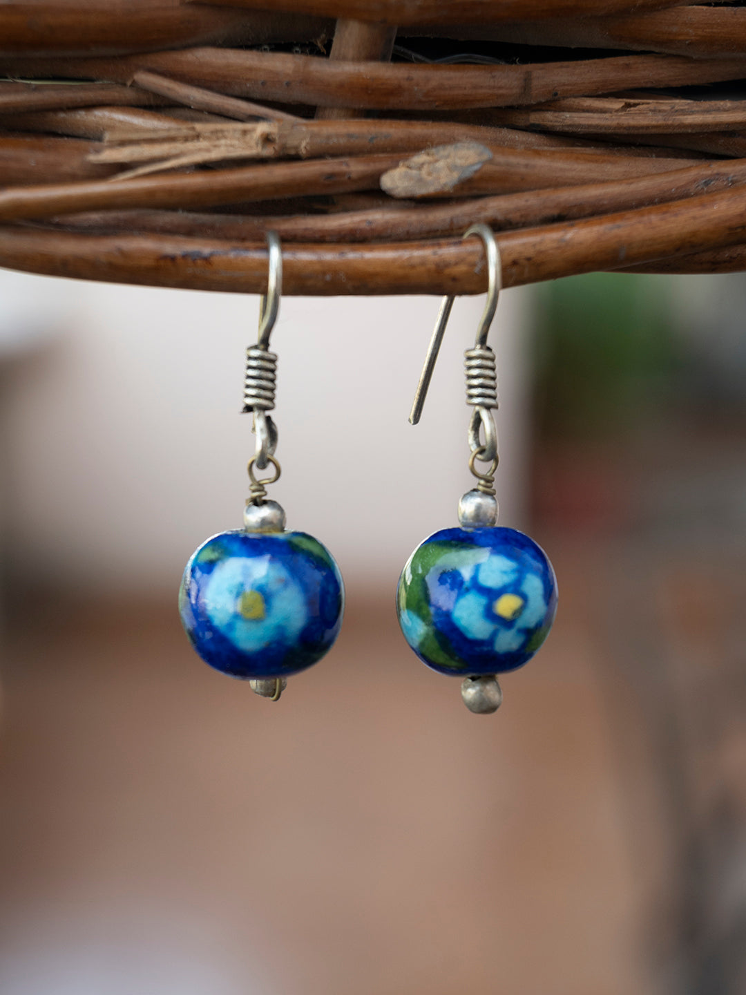 Handmade Single Bead Blue Pottery Earrings (Blue & Green)