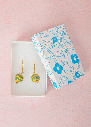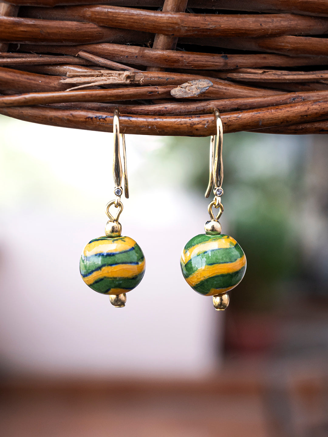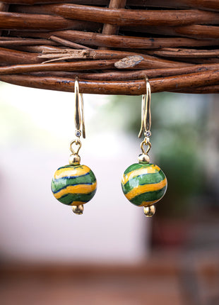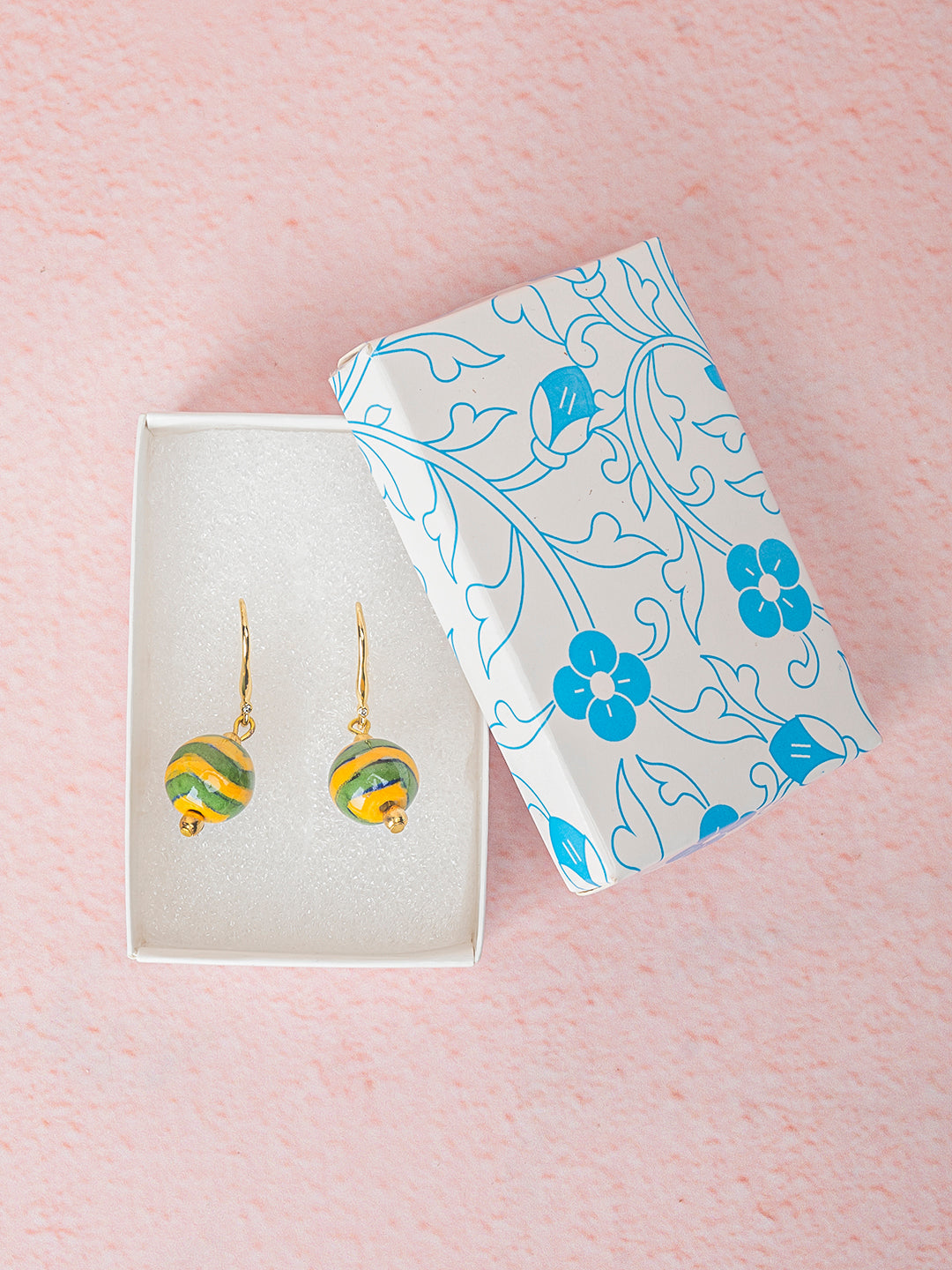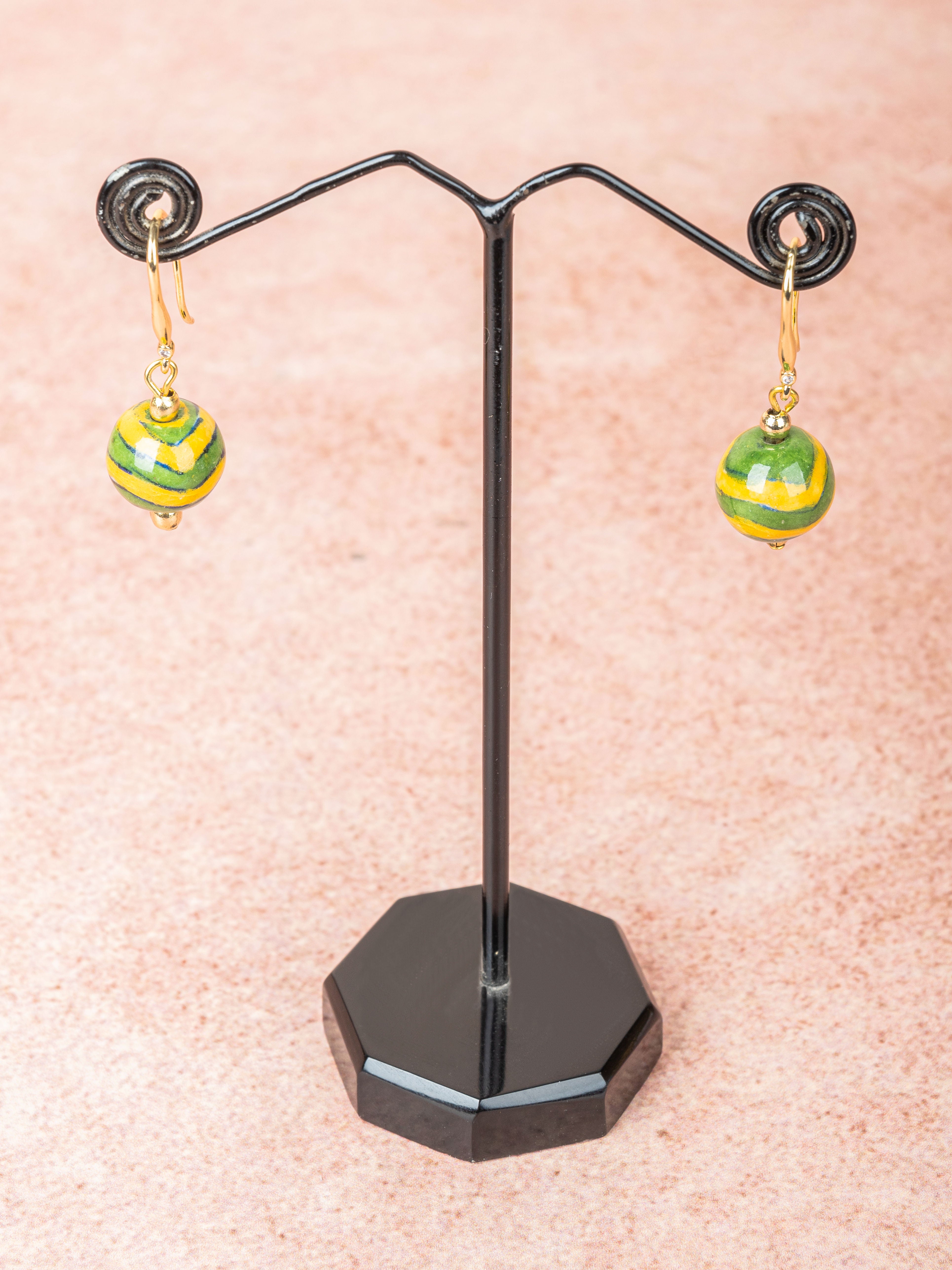 Handmade Single Bead Blue Pottery Earrings (Yellow & Green)