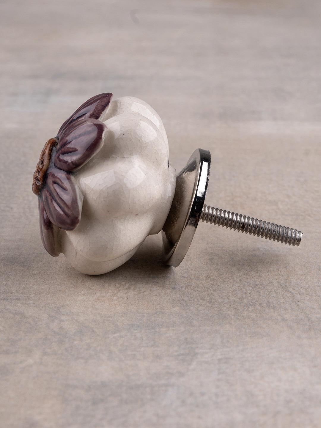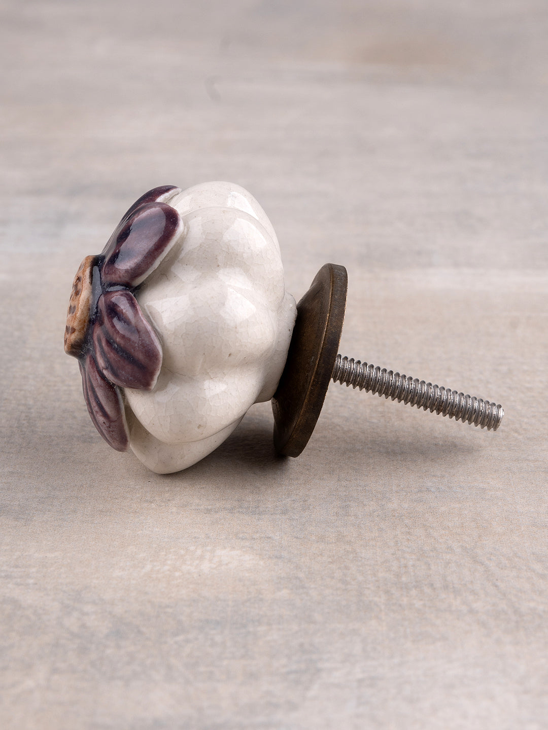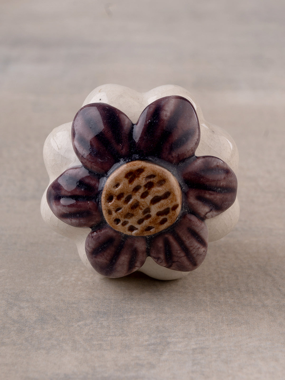 Handmade White & Brown Embossed Flower Shape Ceramic Knob
