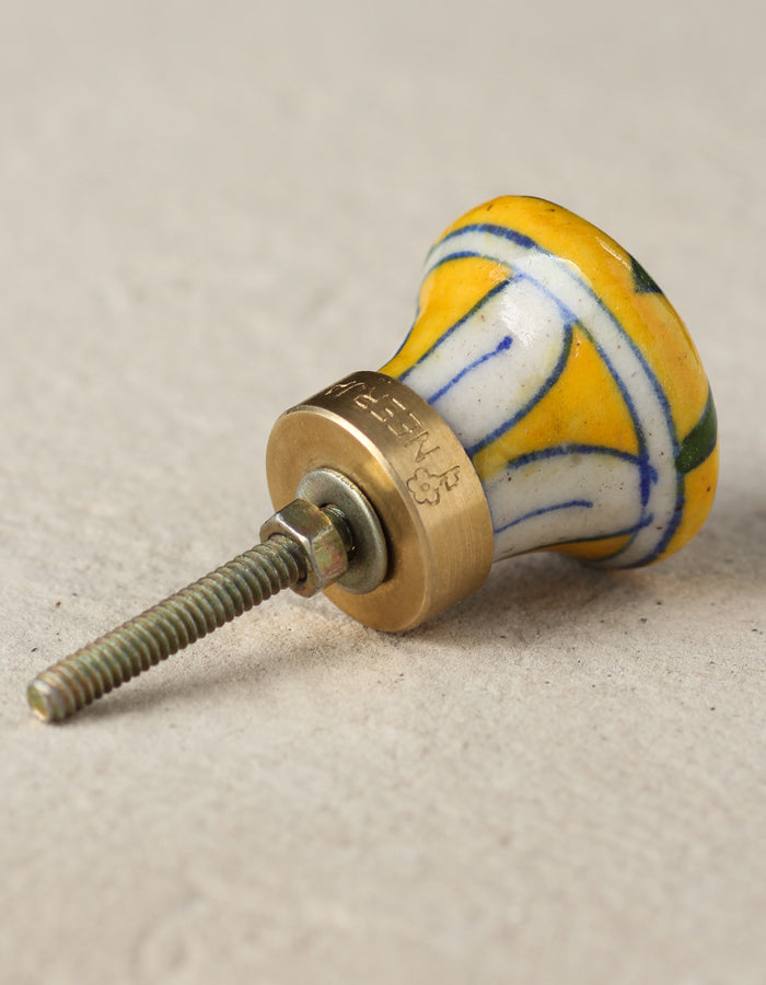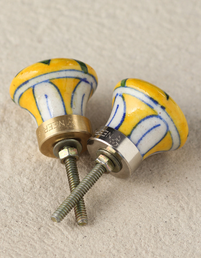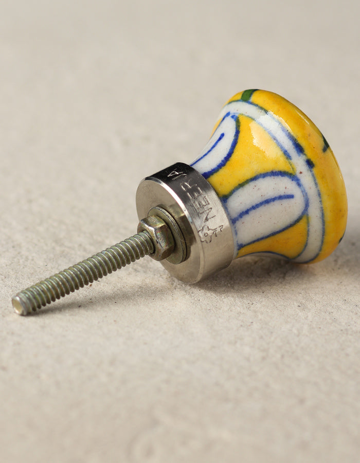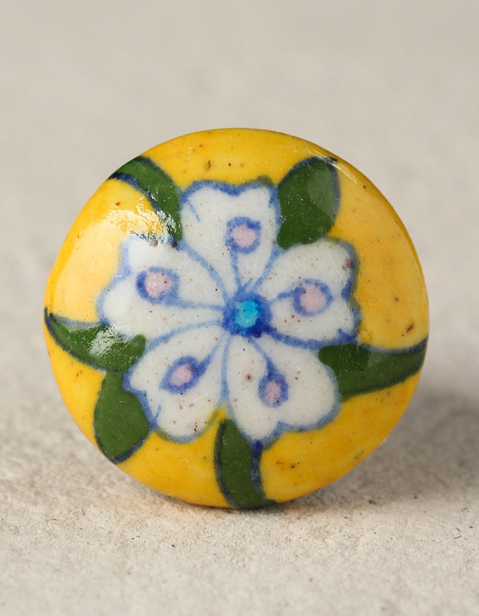 Handmade Yellow Ceramic Blue Pottery Knob With White Flower
