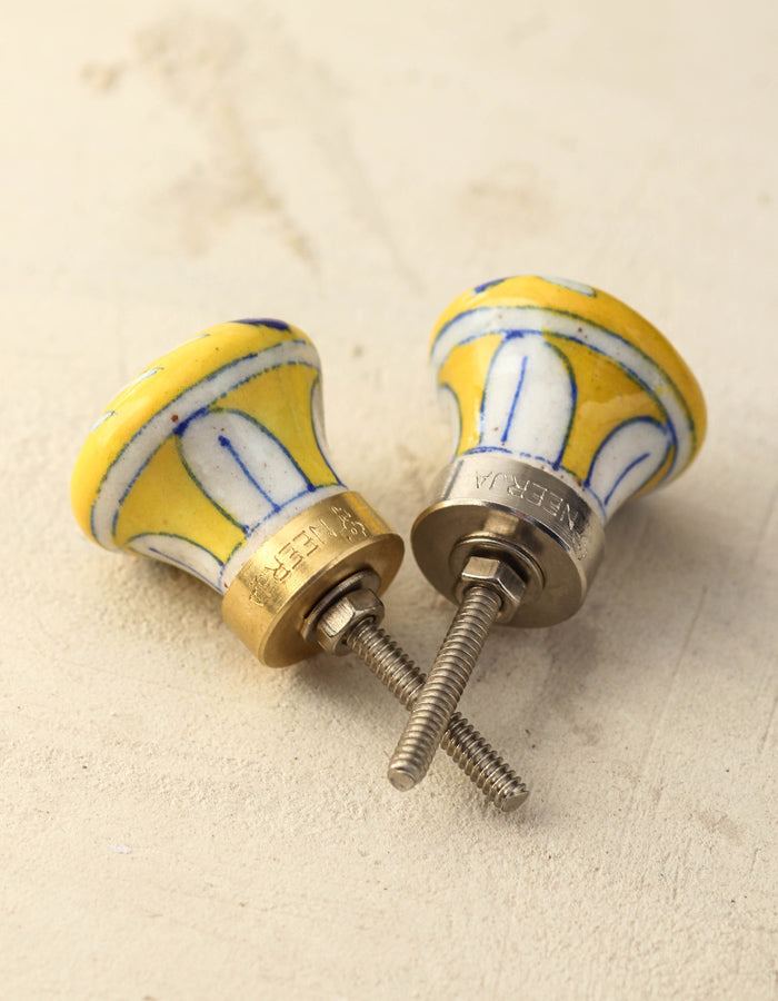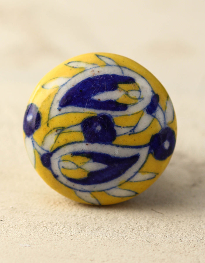 Handmade Yellow Ceramic Door Knob With Blue And White Design