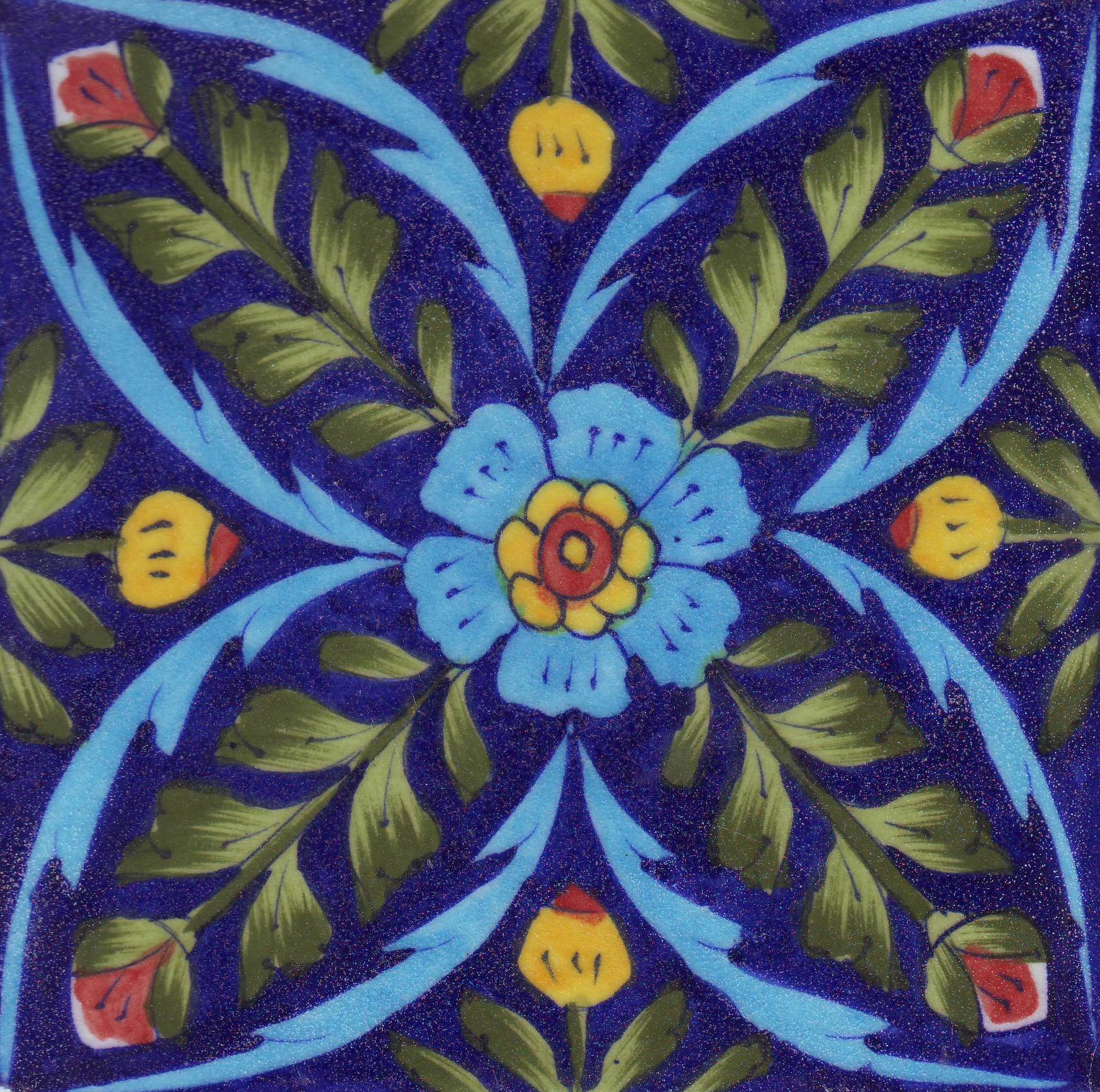 Lime Green Leafs and Turquoise,Brown,Blue,Yellow Flowers with Blue Base Tile