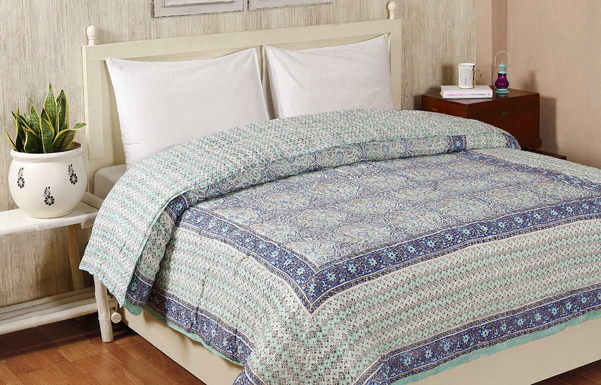 Lusture Aqua and Blue Hand Block Print Cotton Quilt