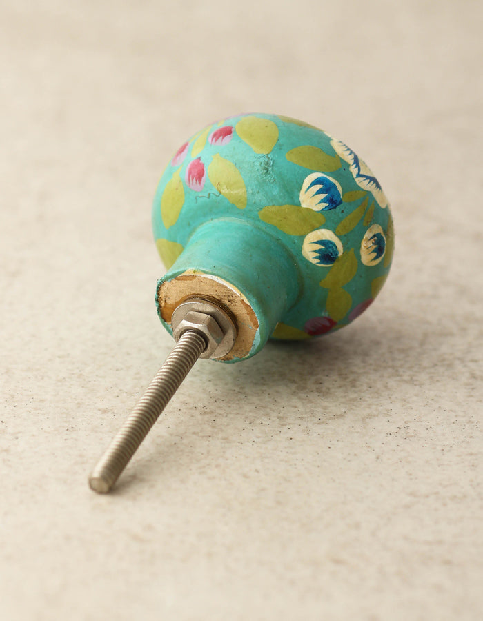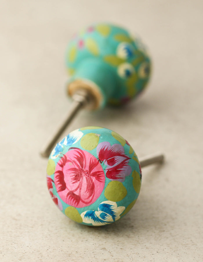 Pink and Lime Blue Flower With green Leaves Wooden Knob