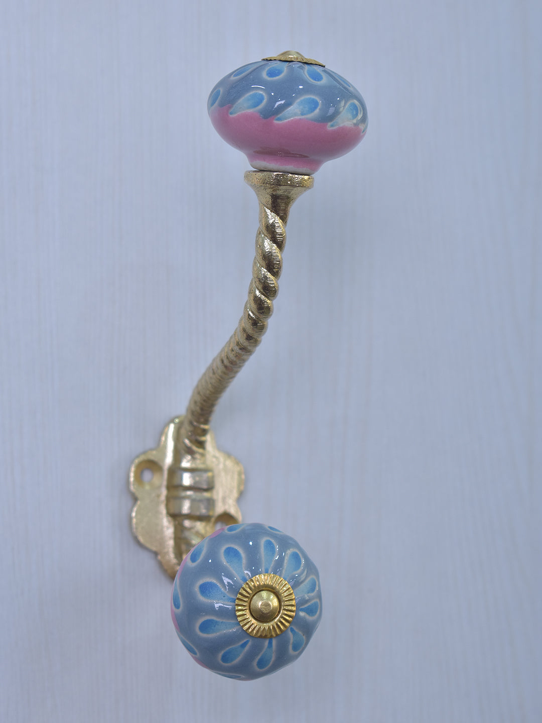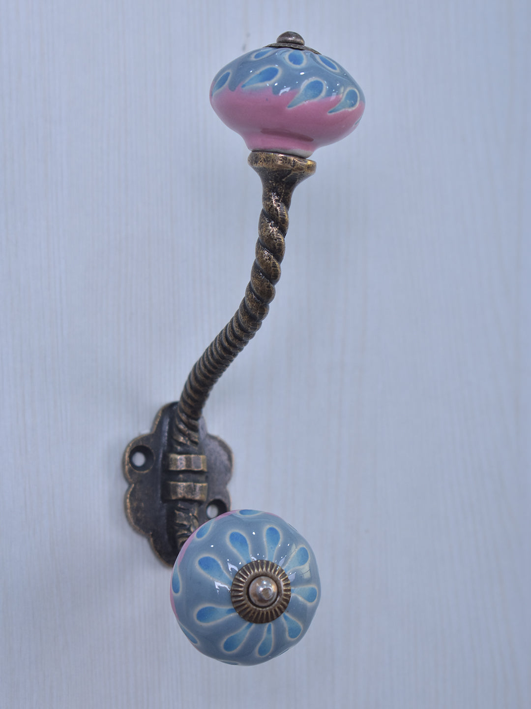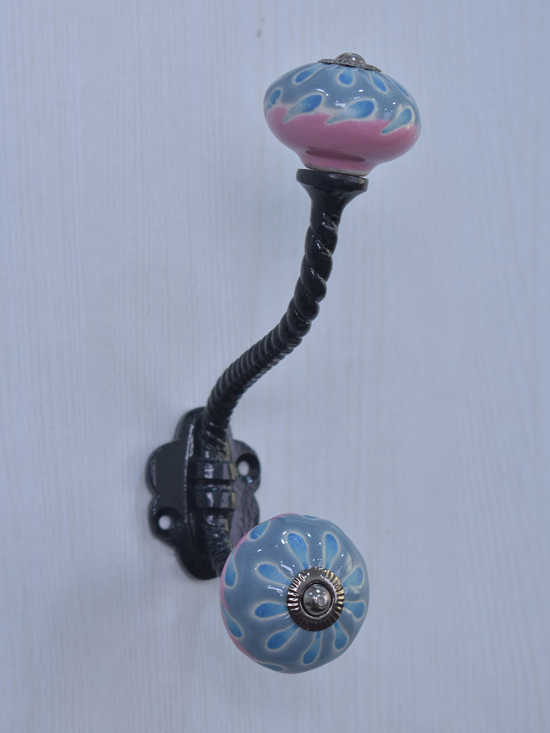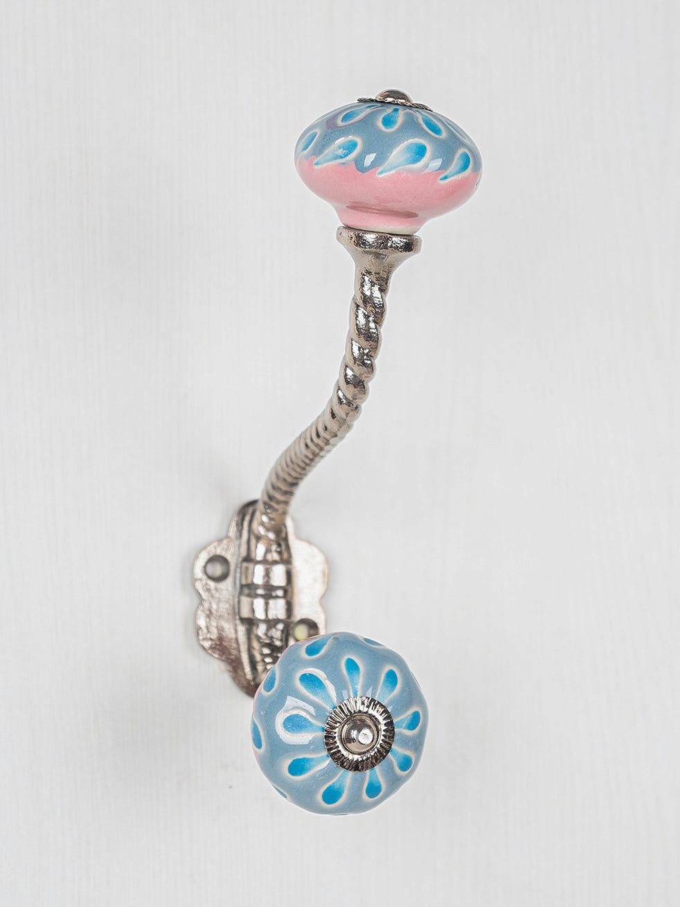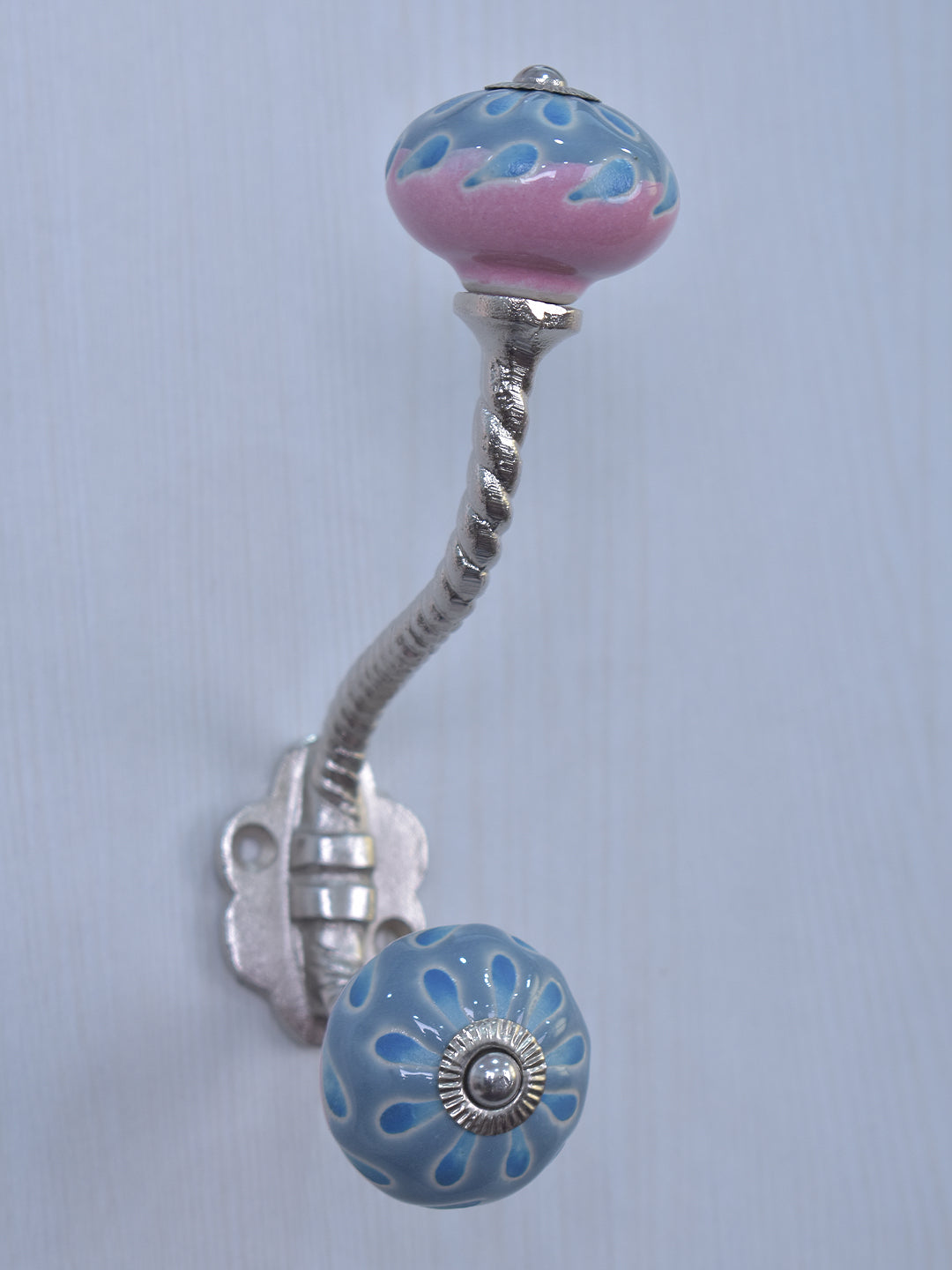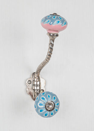 Powder Blue Round Ceramic Knob Turquoise Flower With Metal Wall Hanger