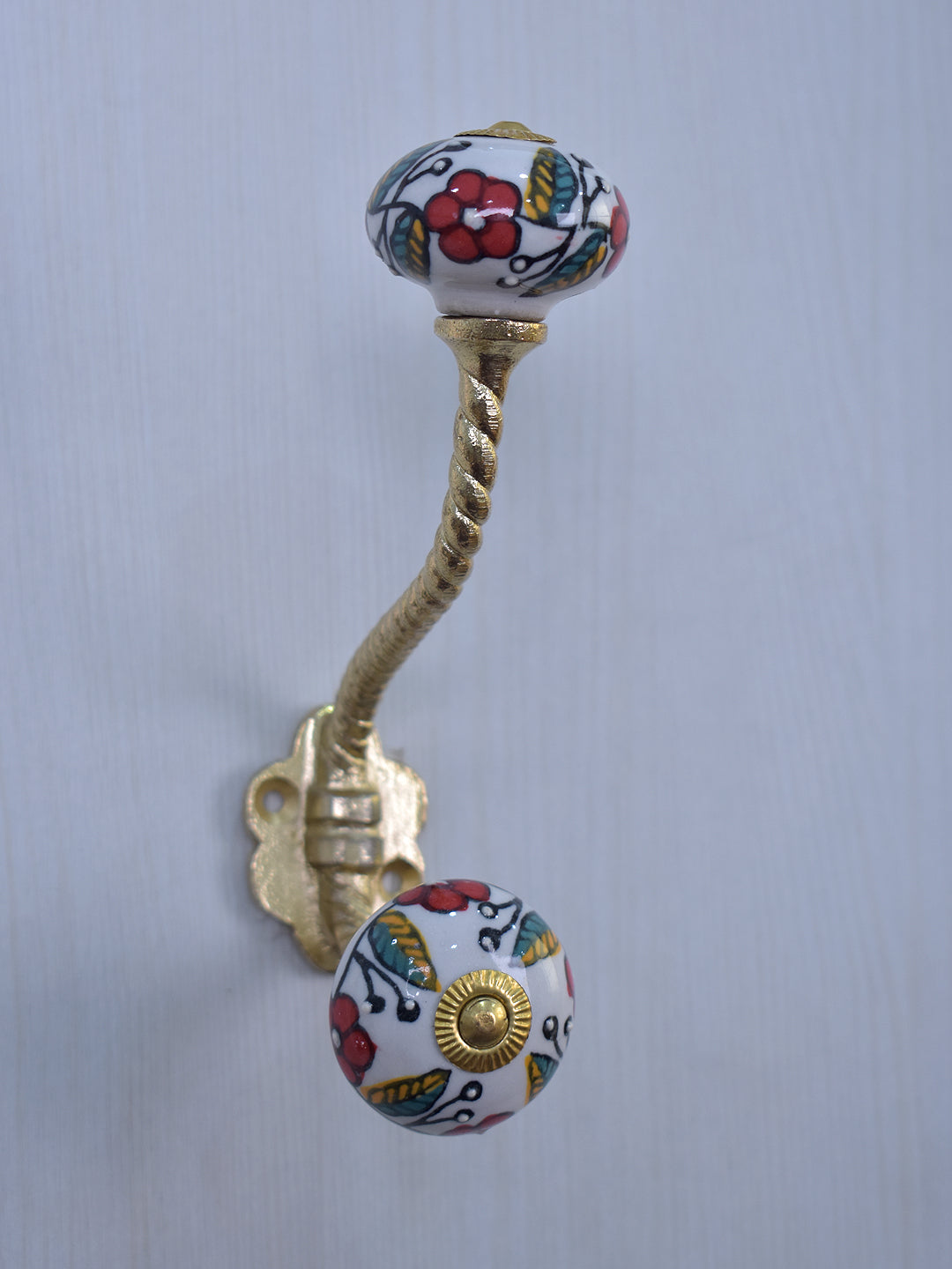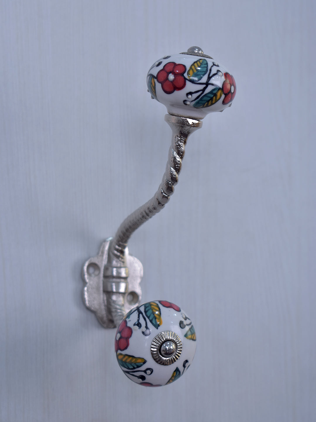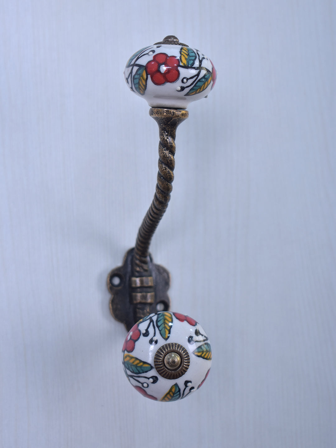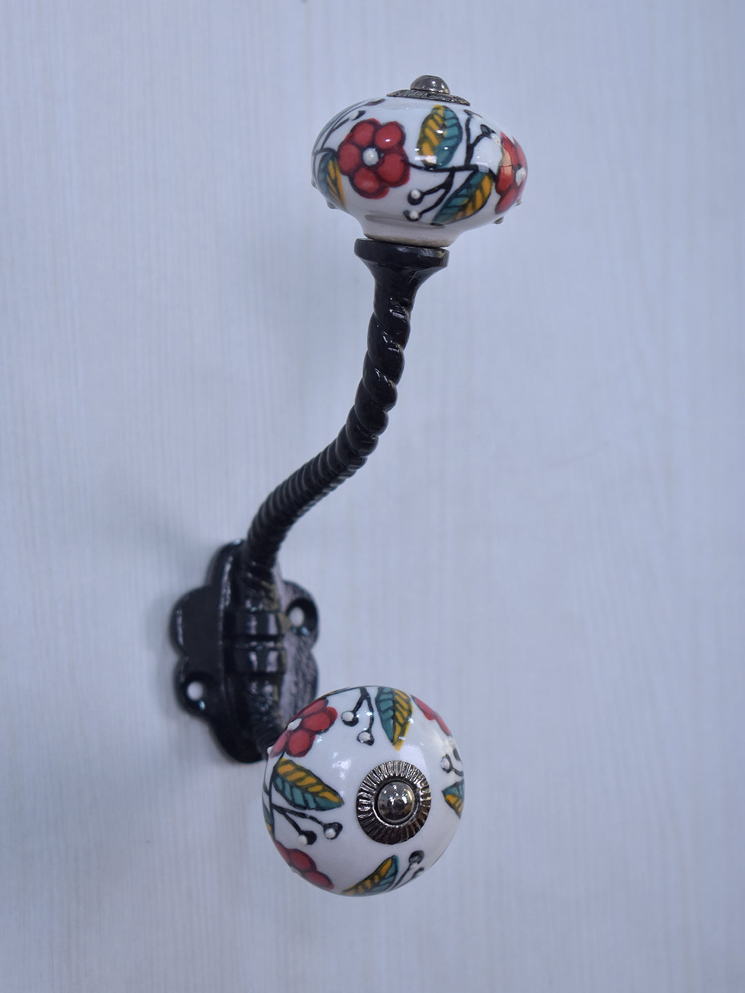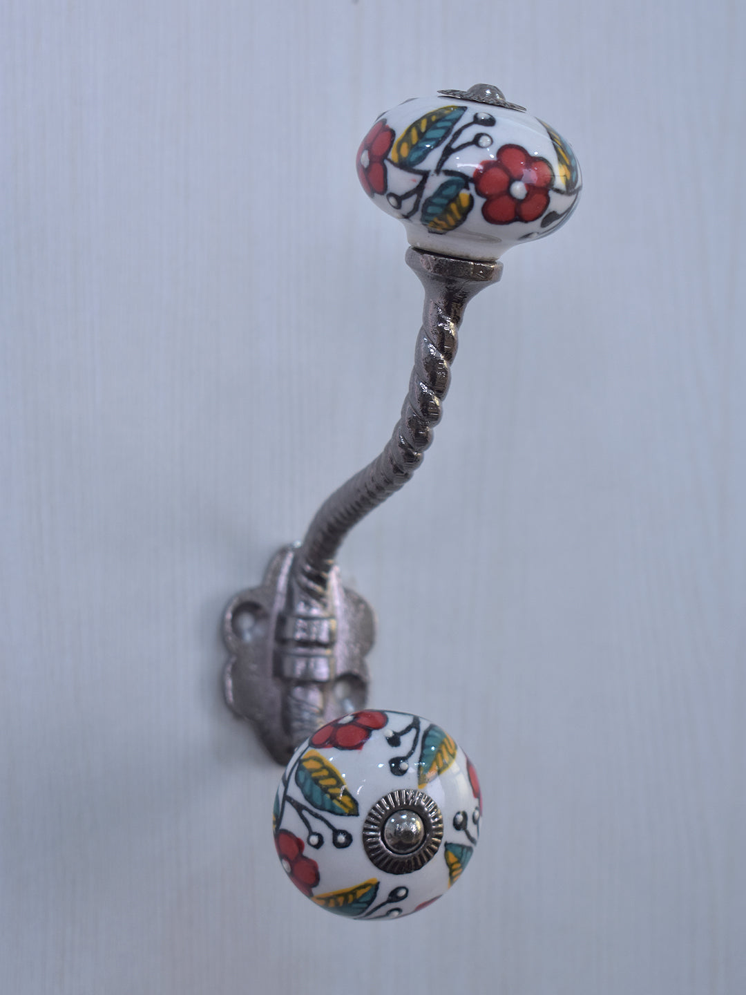 Red Flower On White Ceramic Cabinet Knob With Metal Wall Hanger