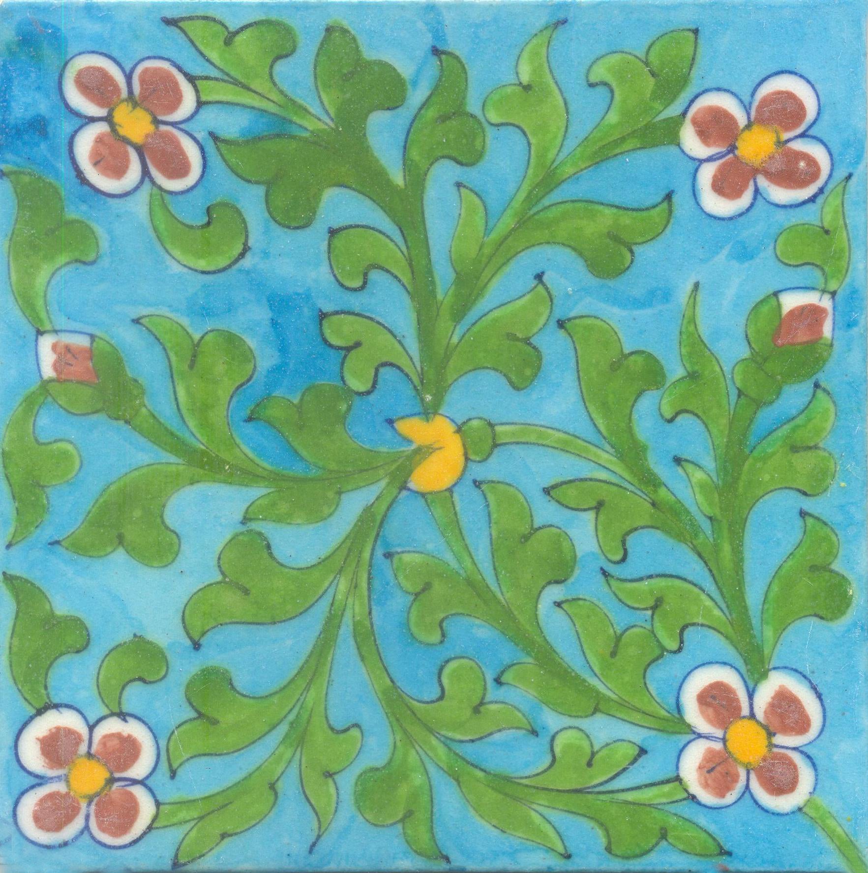 Red Flowers and Green leaf with Turquoise Base Tiles . Unique, hand painted tiles for your kitchen or other tiling project. Tile is "6x6" in size. Delivery time is normally 5 to 7 business days. If the item is out of stock, production and delivery will take 2 to 3 weeks.