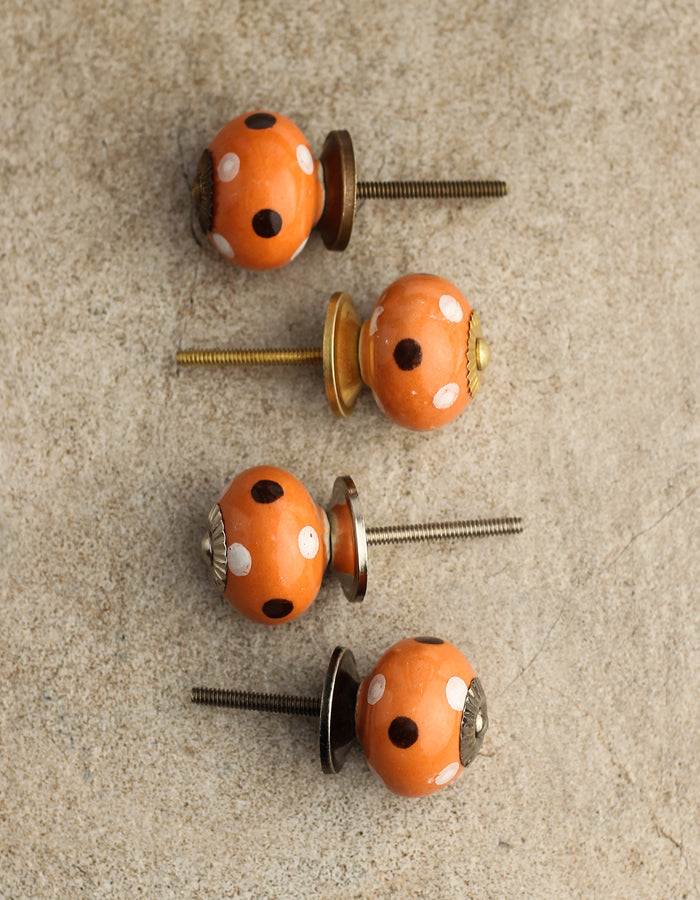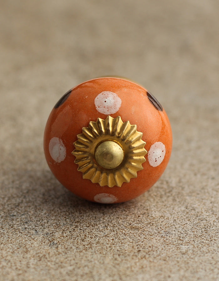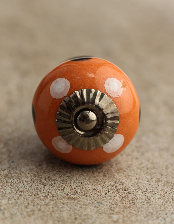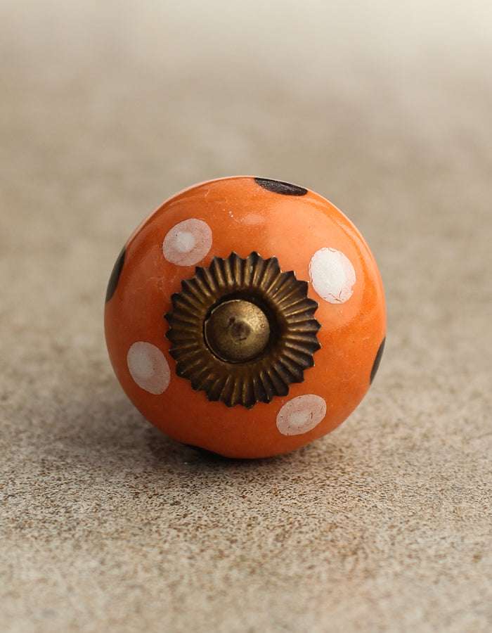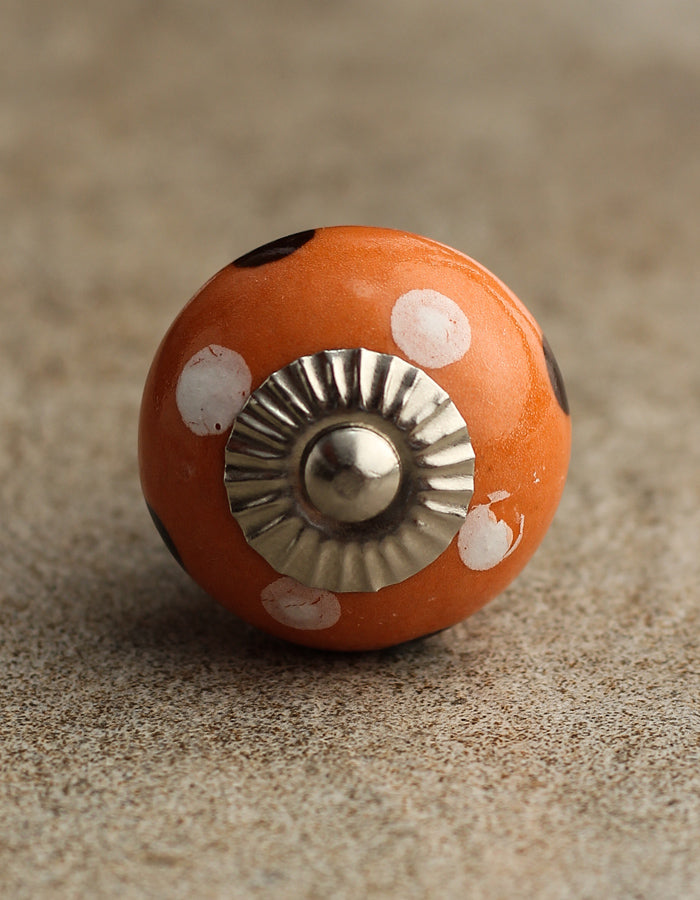 Round Orange Cabinet Knob With White And Brown Polka Dots