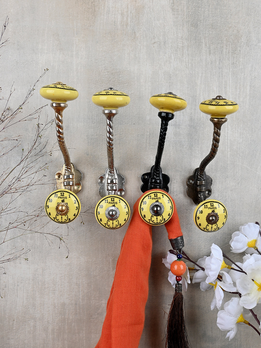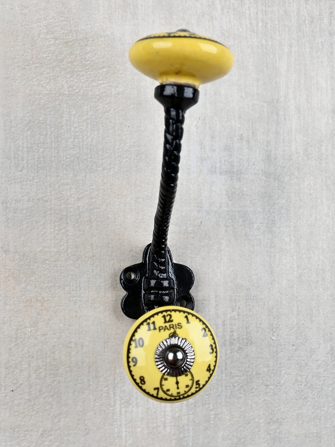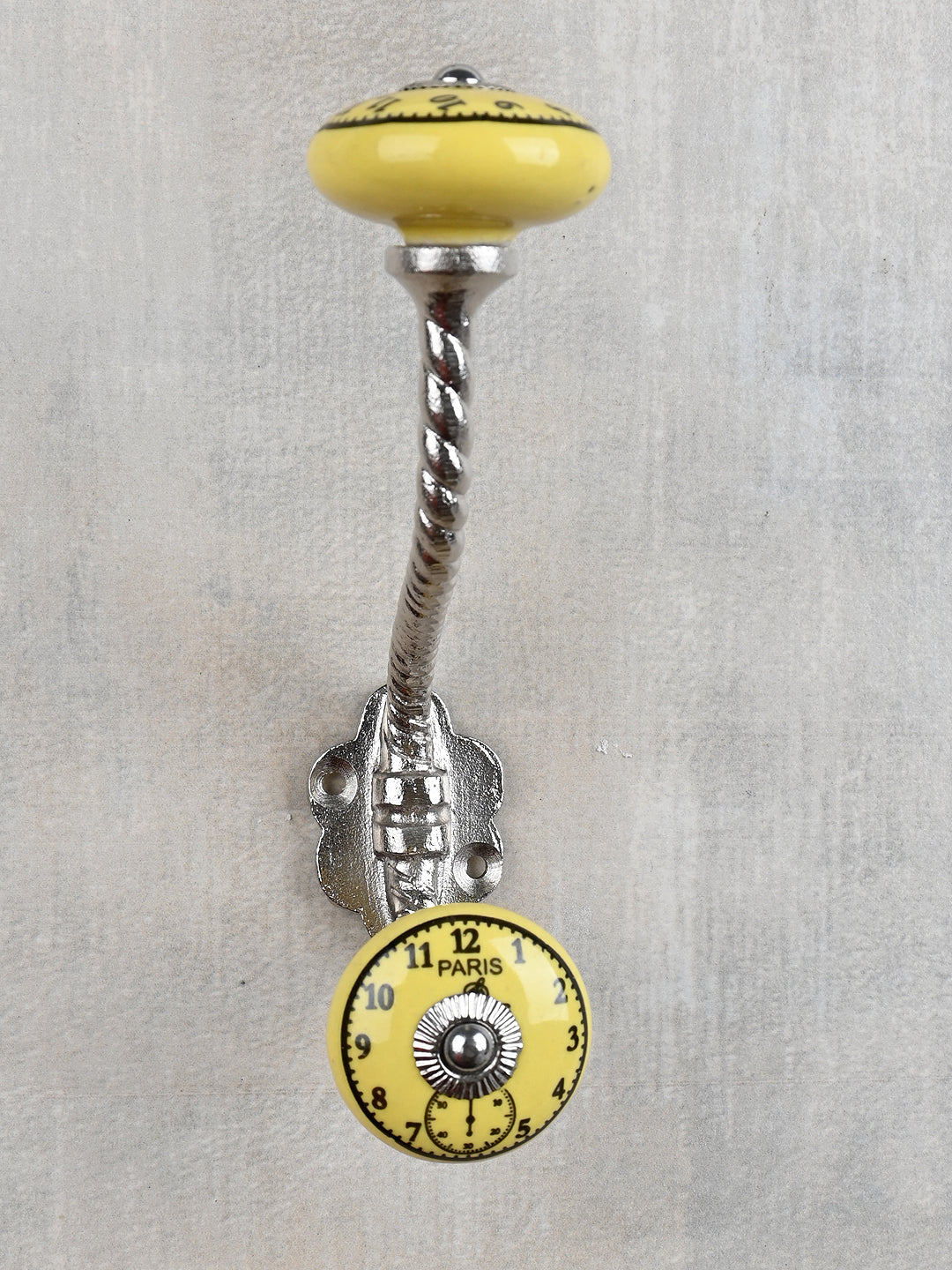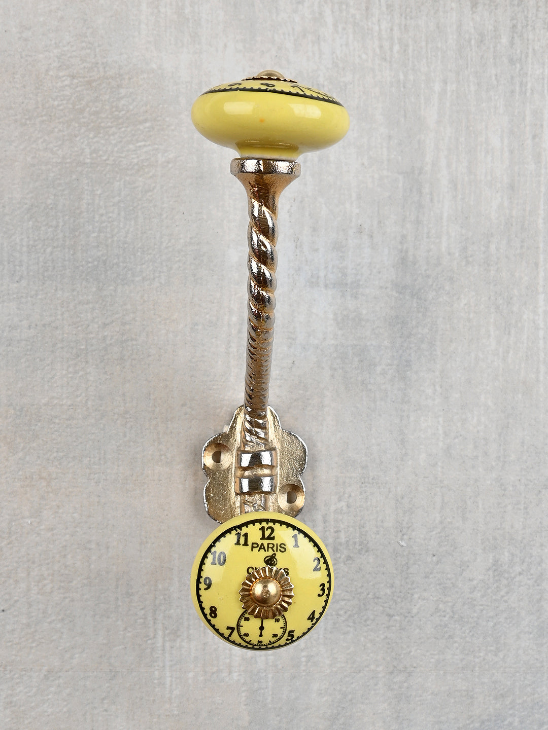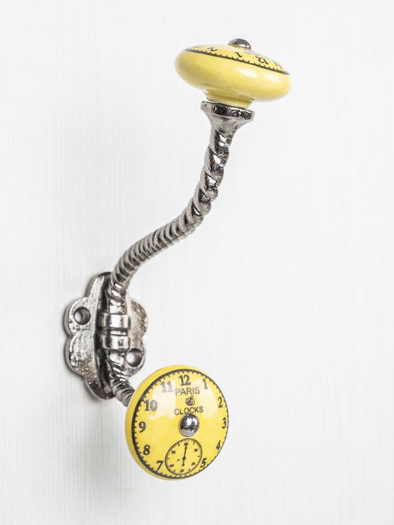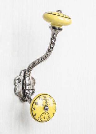 Round Yellow Clock Ceramic Knob With Metal Wall Hanger