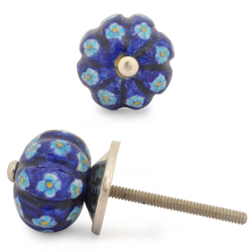 Royal Blue Melon Shaped Ceramic Bathroom Knob With Turquoise Flowers