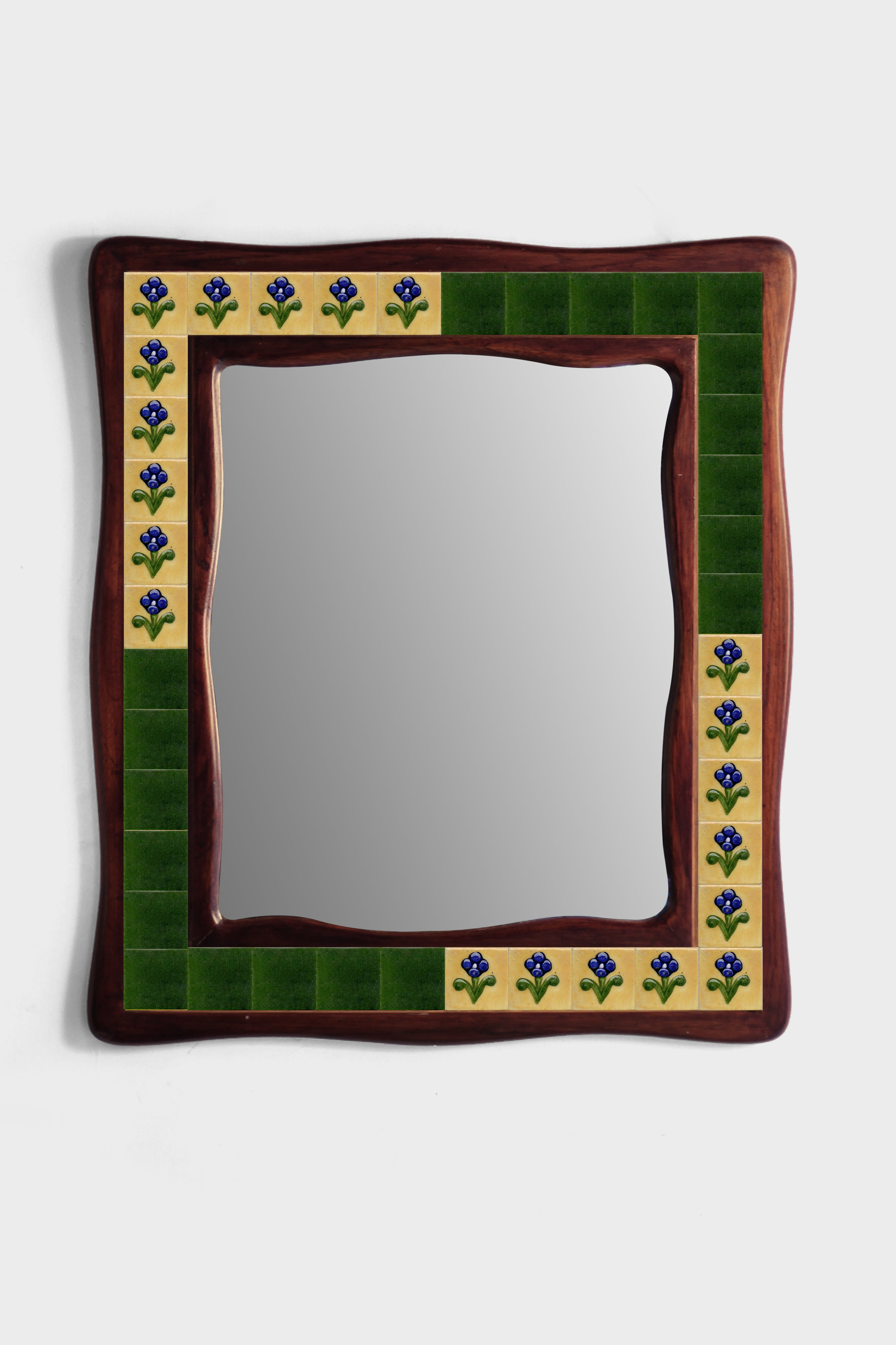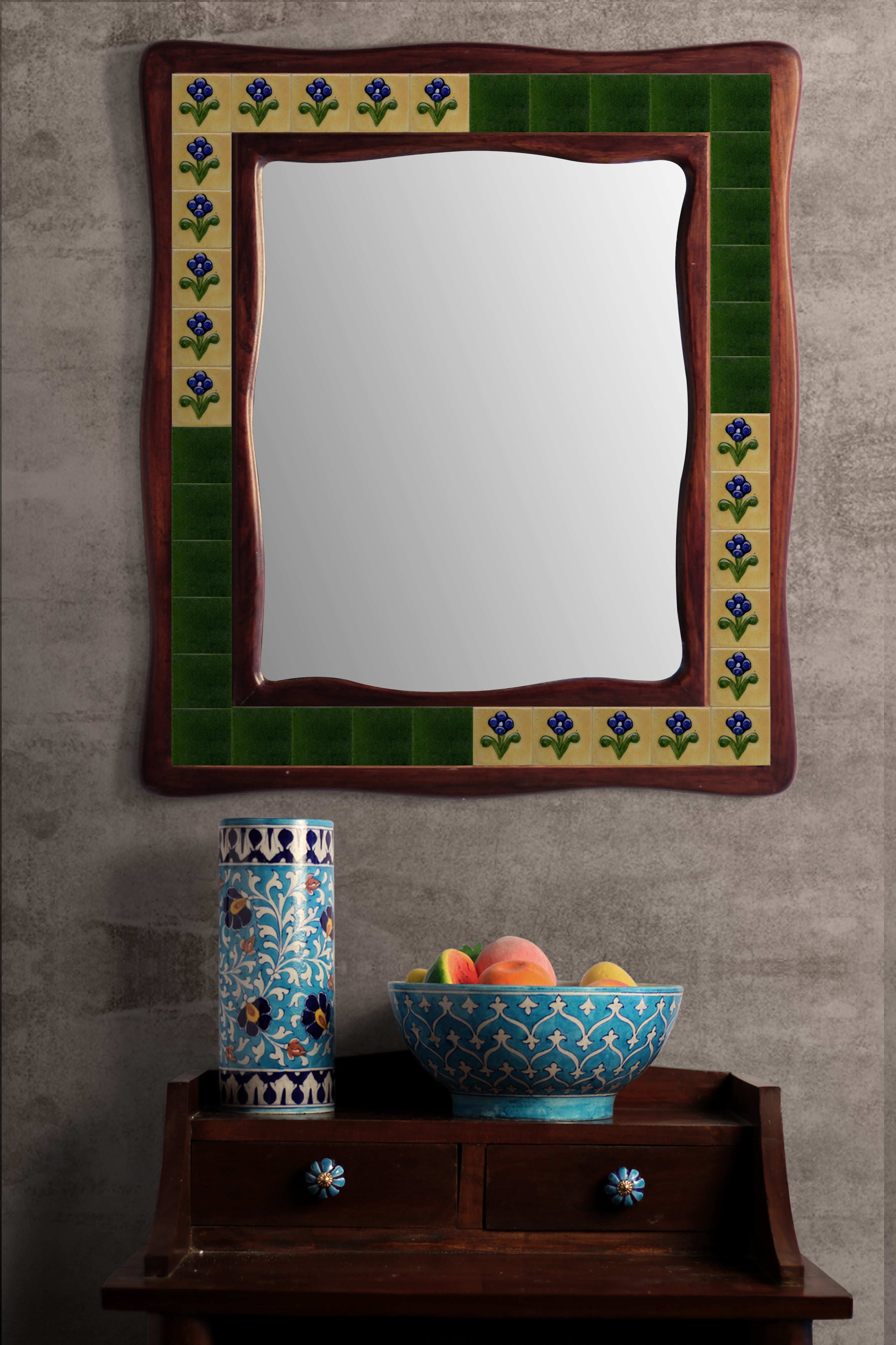 Solid Green With Blue Flowers On Yellow Tile Mirror